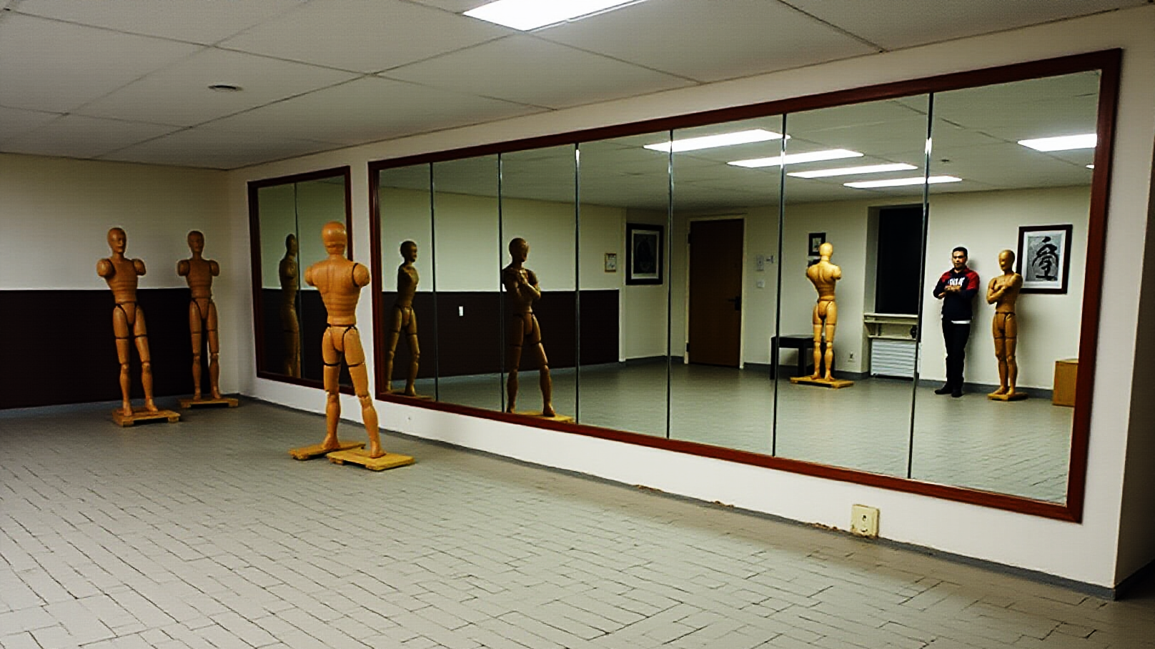 Дверь была открыта. Зал оказался небольшим и акцентированно аскетичным. Никаких позолоченных драконов или алтарей я не увидел. В зале стояла простая зеркальная стена, несколько деревянных манекенов и потрескавшиеся от времени каменные плиты пола. Тишина, нарушаемая лишь ритмичными звуками ударов.