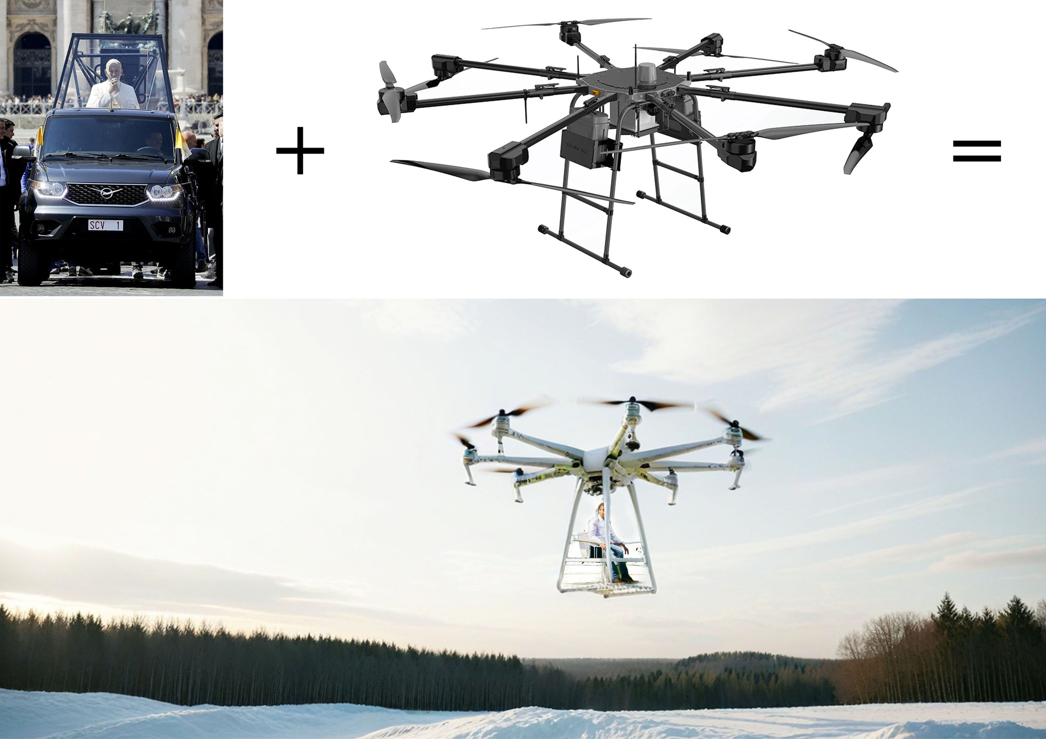 Поездка по городу на автомобиле. Если нужно на дачу - используется квадрокоптер. То есть авто остается на парковке на окраине города и дальше на дроне на автопилоте - можно начинать отдыхать