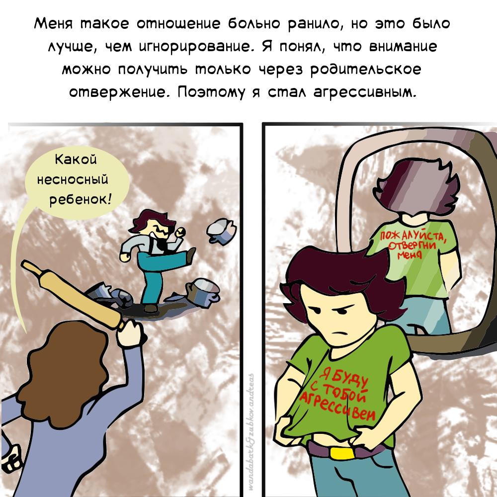 Представим семью, где маленькому мальчику Эрику сильно не хватало положительных поглаживаний. Чтобы получить хоть какие-то, ему приходилось громко плакать и ныть, чтобы мама обратила на него внимание. Не справляясь с капризным ребенком, родители нервничали и наказывали его негативными поглаживаниями и отвержением (например, «Если ты будешь плакать, я тебя брошу и отдам в детский дом»). Мальчика такие фразы ранили, но они были лучше, чем полное игнорирование, поэтому он сделал такой вывод: «Я могу получать поглаживания только через отвержение, для этого мне нужно быть агрессивным». Поэтому во взрослой жизни в отношениях с женщинами он будет вести себя, как в детстве с мамой, чтобы в итоге его отвергли. Таким образом спереди на его футболке будет написано «Я буду с тобой агрессивен!», а сзади – «Пожалуйста, брось меня».