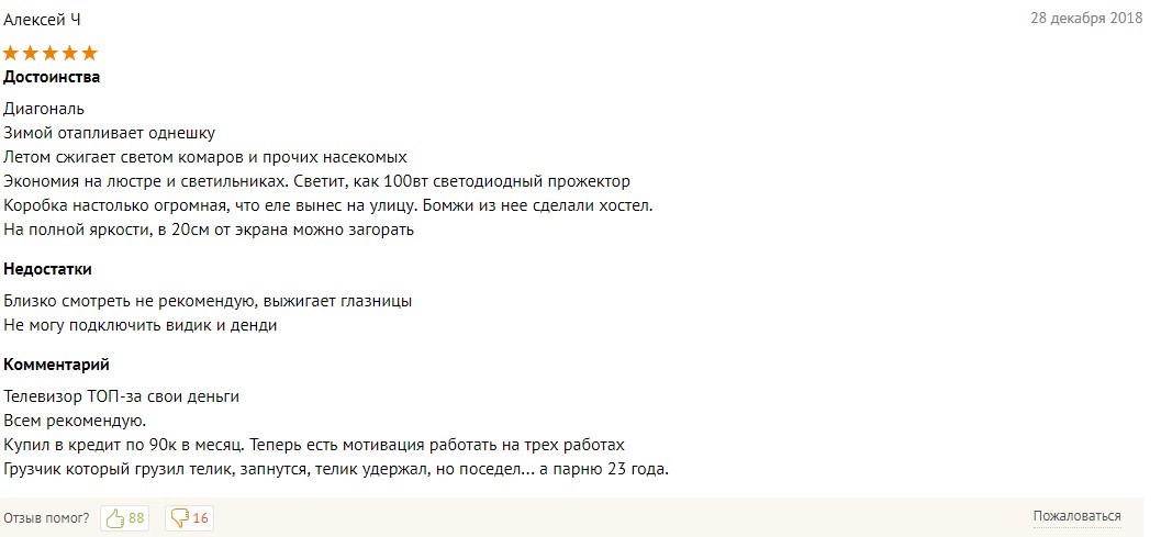 Tyzeg Комментарии 6 лет назад Наткнулся на телевизор за 999 990, решил почитать отзывы Комментарии Техника Длиннопост