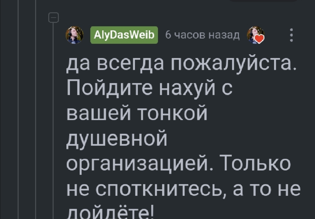 да всегда пожалуйста. Пойдите нахуй с вашей тонкой душевной организацией. Только не споткнитесь, а то не дойдёте!