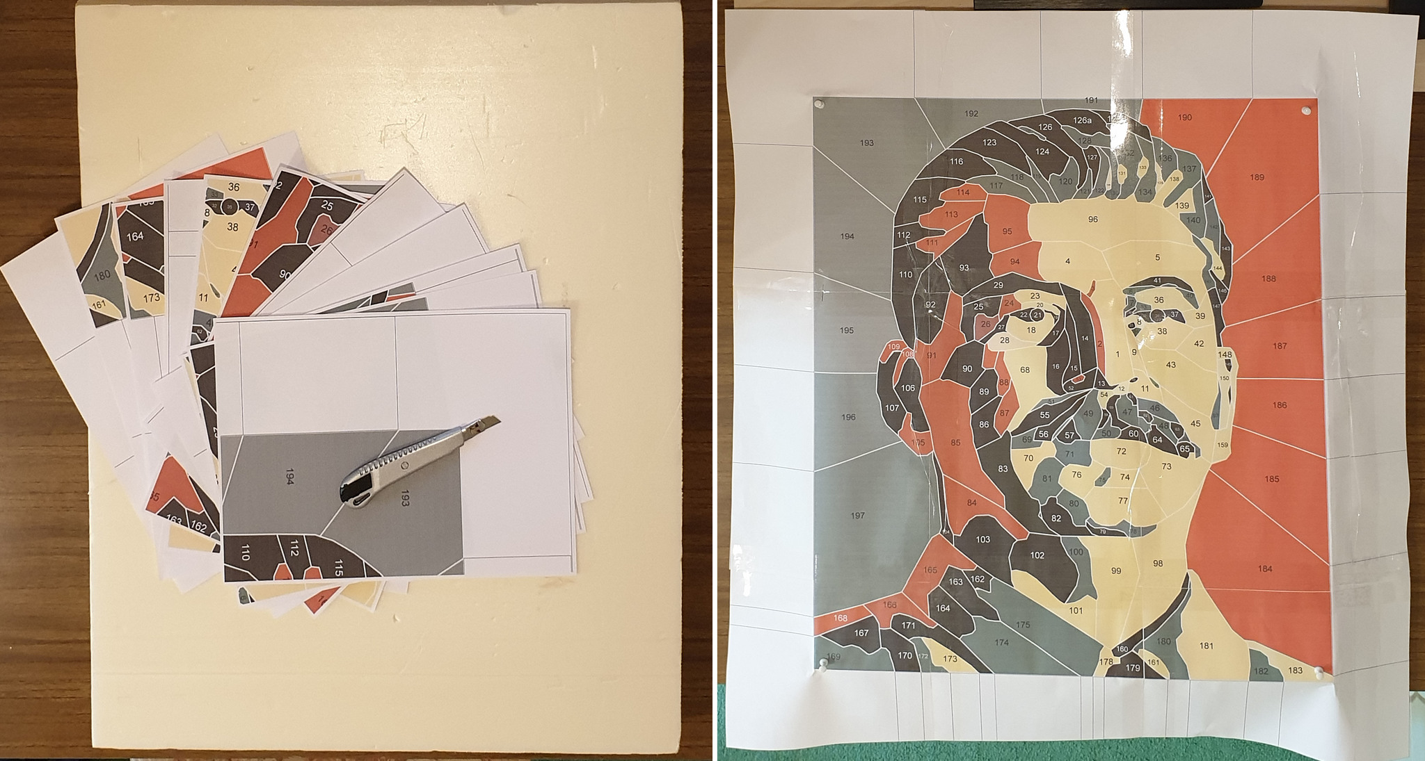 Для начала выбираем портрет, достаточно упрощенный и с небольшим количеством цветов. Разбиваем всё на полигоны и номеруем. Детали, примыкающие к контуру, делаем с запасом, чтобы можно было обернуть кромку.