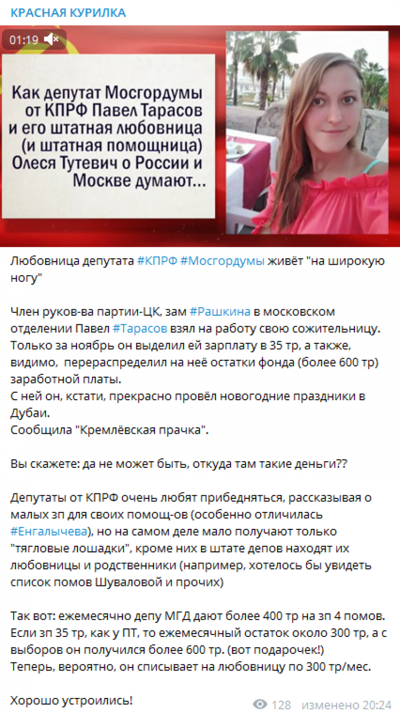 Telegram-канал «Красная Курилка» опубликовал пост, в котором утверждается, что помощница депутата Мосгордумы от КПРФ Павла Тарасова, которая по совместительству является его любовницей, «живет на широкую ногу». Тарасов, помимо стандартной зарплаты в 35 тысяч рублей, перераспределил остатки зарплатного фонда на помощников, подняв выплаты до 600 тысяч рублей в месяц. Кроме того, сообщалось, что парламентарий приобрел для себя и своей девушки дорогой тур в Дубай на новогодние праздники."