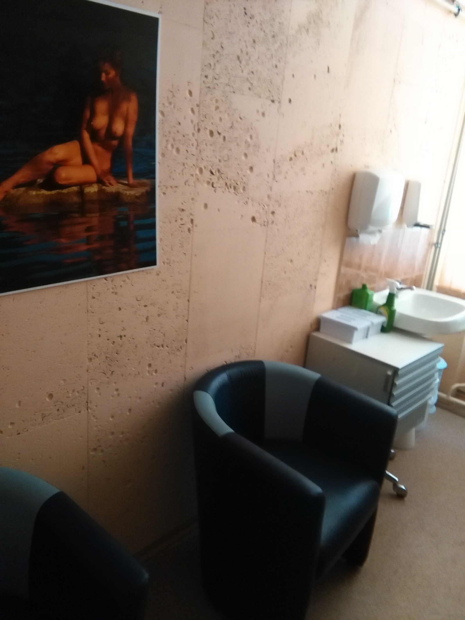 Очень располагает, не правда ли?) Кроме висящих на стене сомнительных плакатов я больше ничего не нашел. А гудящие под дверью женщины не добавляли энтузиазма. Хвала интернету и сайтам для взрослых. Представляю, когда сюда приходят мужчины без внешних источников эротической информации.