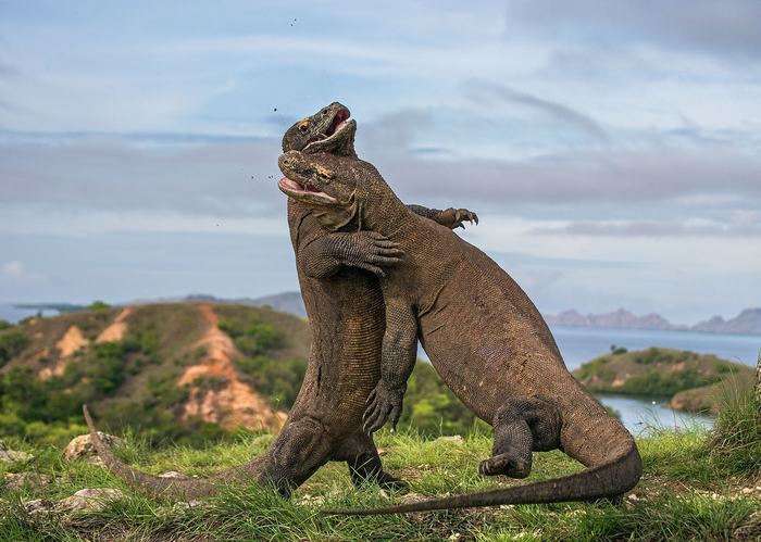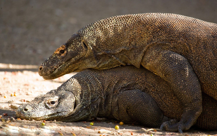 Чтоб выбить себе право лечь на самку, вараны устраивают настоящую феерическую кавказскую борьбу. Два здоровых лба встают на задние ноги и начинают бороть друг друга. Проигравший часто уходит с множеством рваных ран и погибает.
