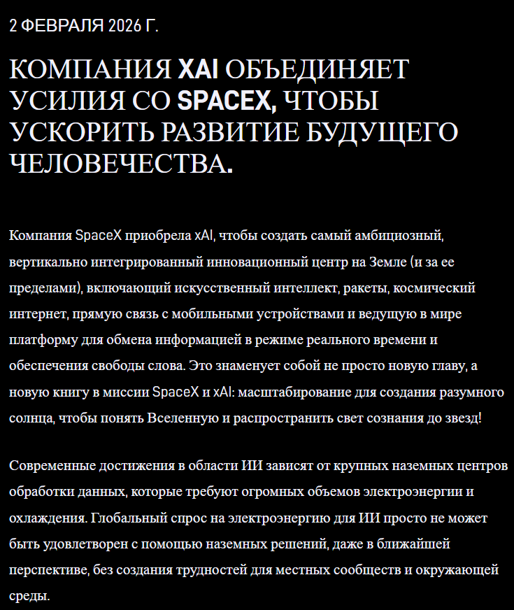 Перевод страницы https://www.spacex.com/updates#xai-joins-spacex (недоступна из РФ):