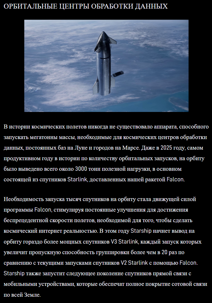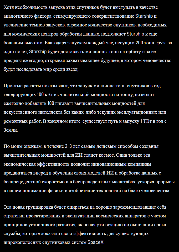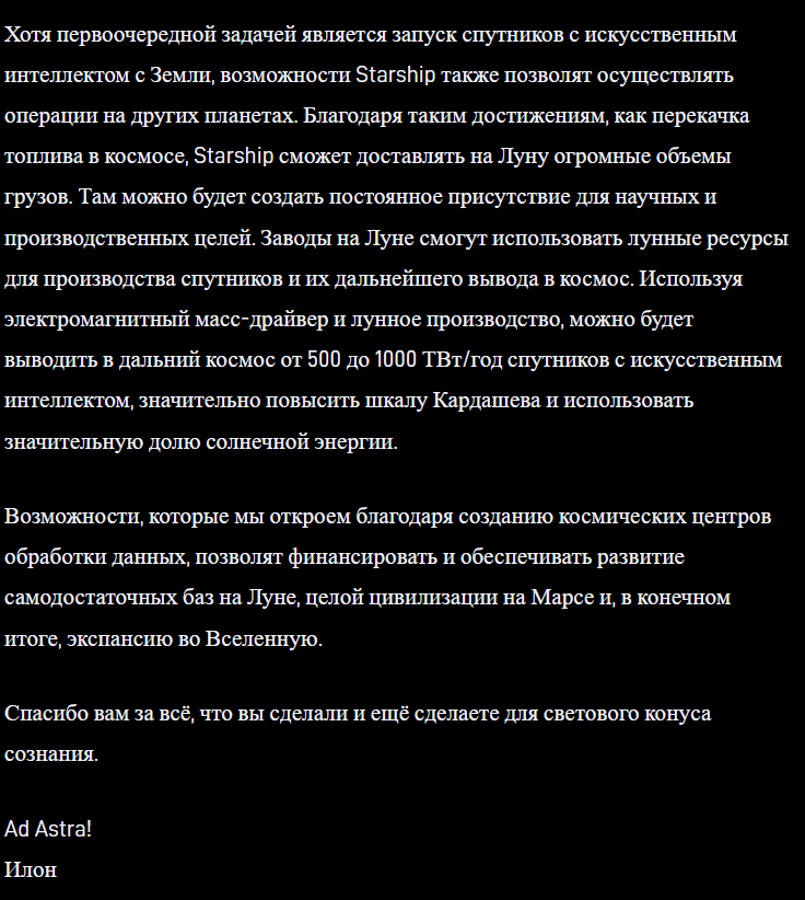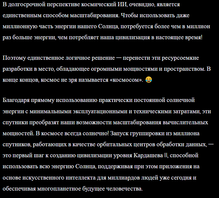Возможности, которые мы откроем благодаря созданию космических центров обработки данных, позволят финансировать и обеспечивать развитие самодостаточных баз на Луне, целой цивилизации на Марсе и, в конечном итоге, экспансию во Вселенную.