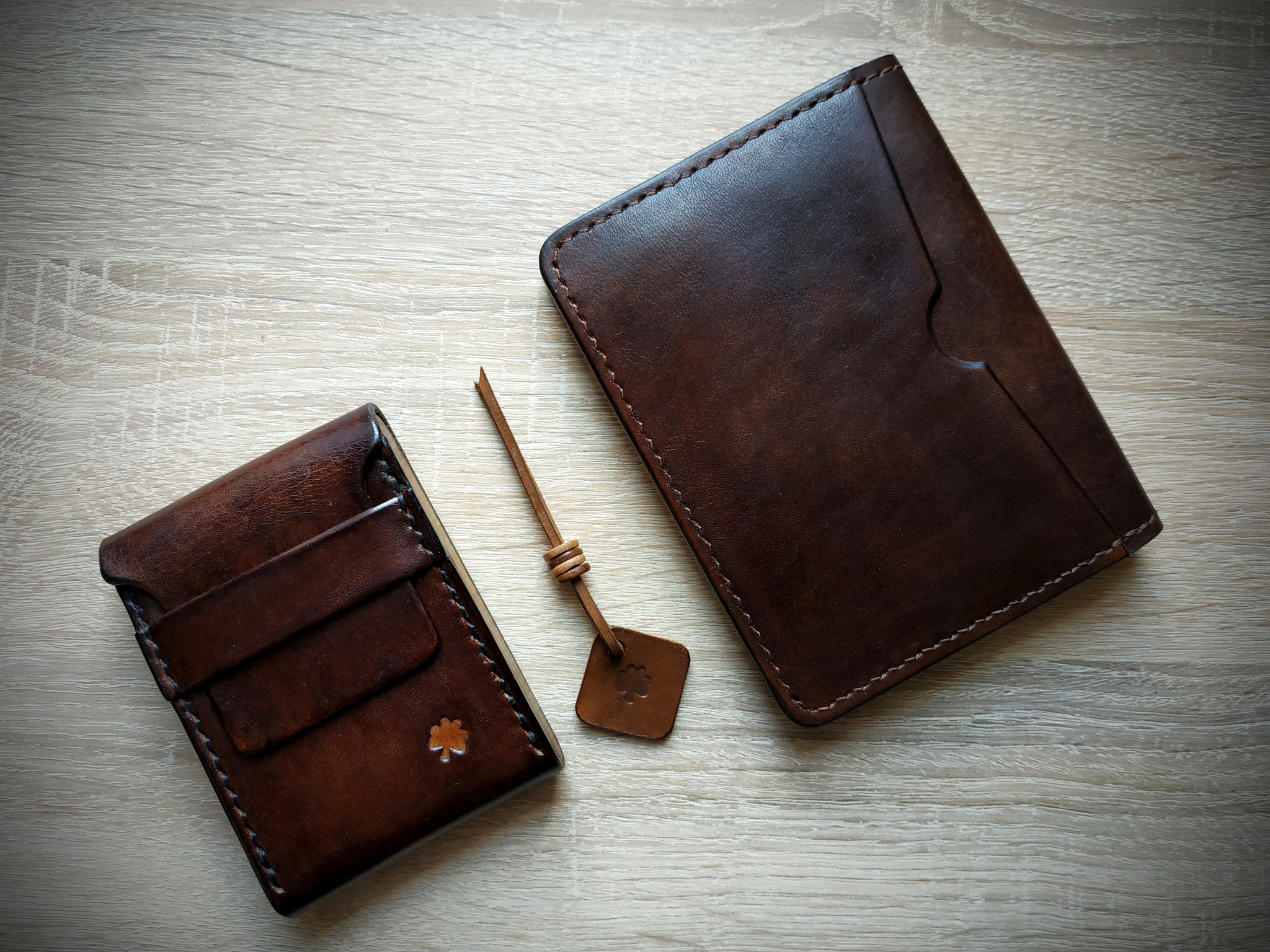 Прошит вручную вощеной нитью седельным швом, края скруглены, окрашен, вскрыт аппретурой и воском.