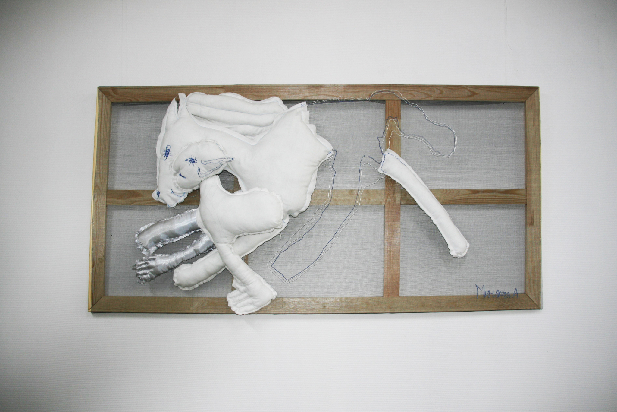 Финальный этап включал сборку композиции в раме. Я вручную вышивала детали, добавляя их на тканевые элементы, и соединяла их с проволокой для создания объема. Результат — это работа, которая живет между скульптурой и живописью, приглашая зрителя к диалогу.