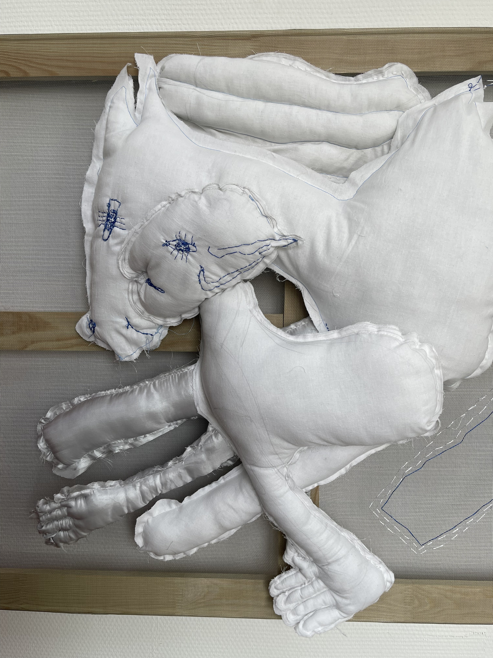 На этапе прототипирования я экспериментировала с тканями, шитьем и проволокой. Было сложно найти баланс между абстракцией и узнаваемостью, но каждый набросок приближал меня к финальной форме. Я тестировала, как материал реагирует на натяжение и сшивание, чтобы добиться нужной динамики.