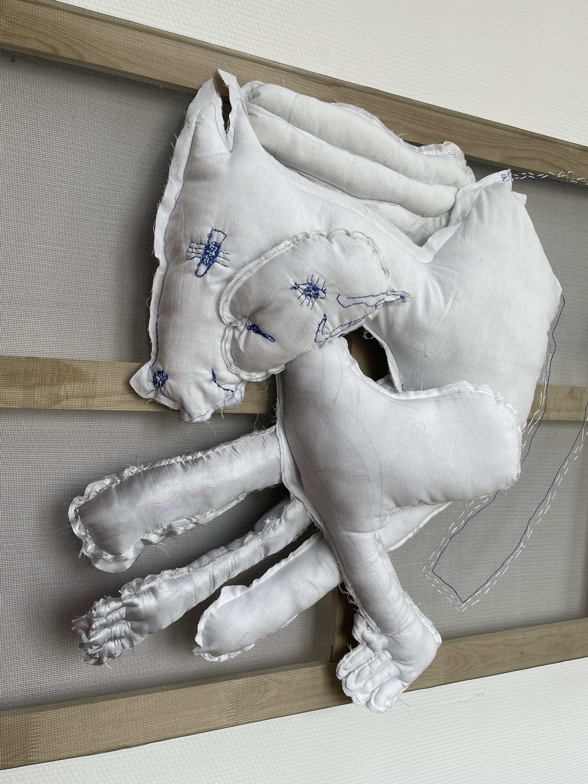 Мой подход строился на экспериментах с текстилем и нитями. Я выбрала белые ткани и металлические ленты, чтобы показать контраст между мягкостью и жесткостью, как в природе. Вышивка с изображениями животных и анатомических деталей стала для меня способом добавить повествование, которое раскрывает тему на интуитивном уровне. Этот процесс требовал терпения, но именно в нем я нашла гармонию.