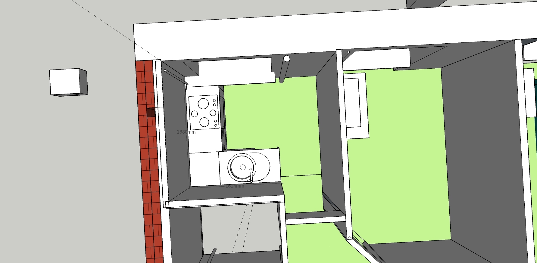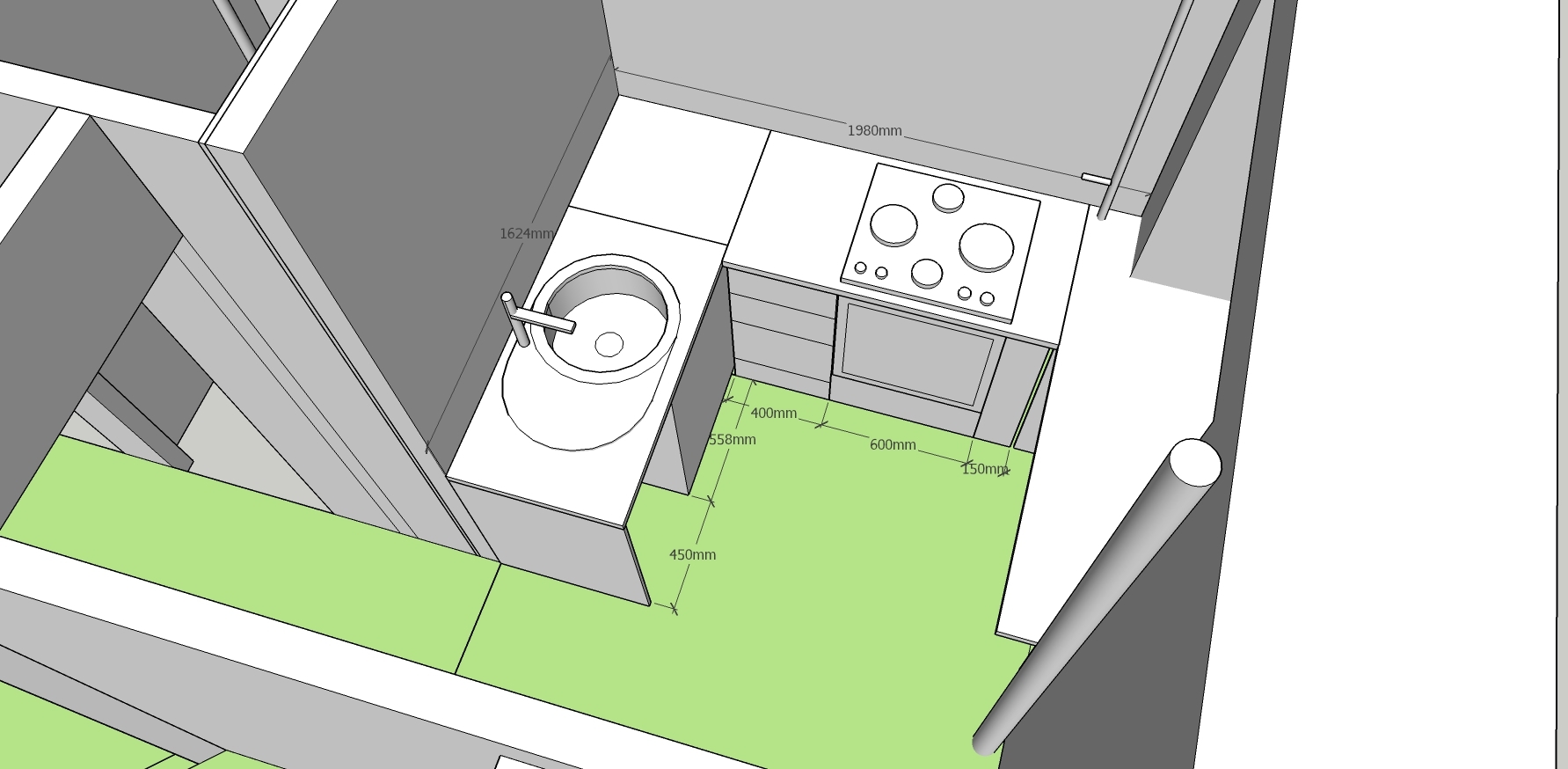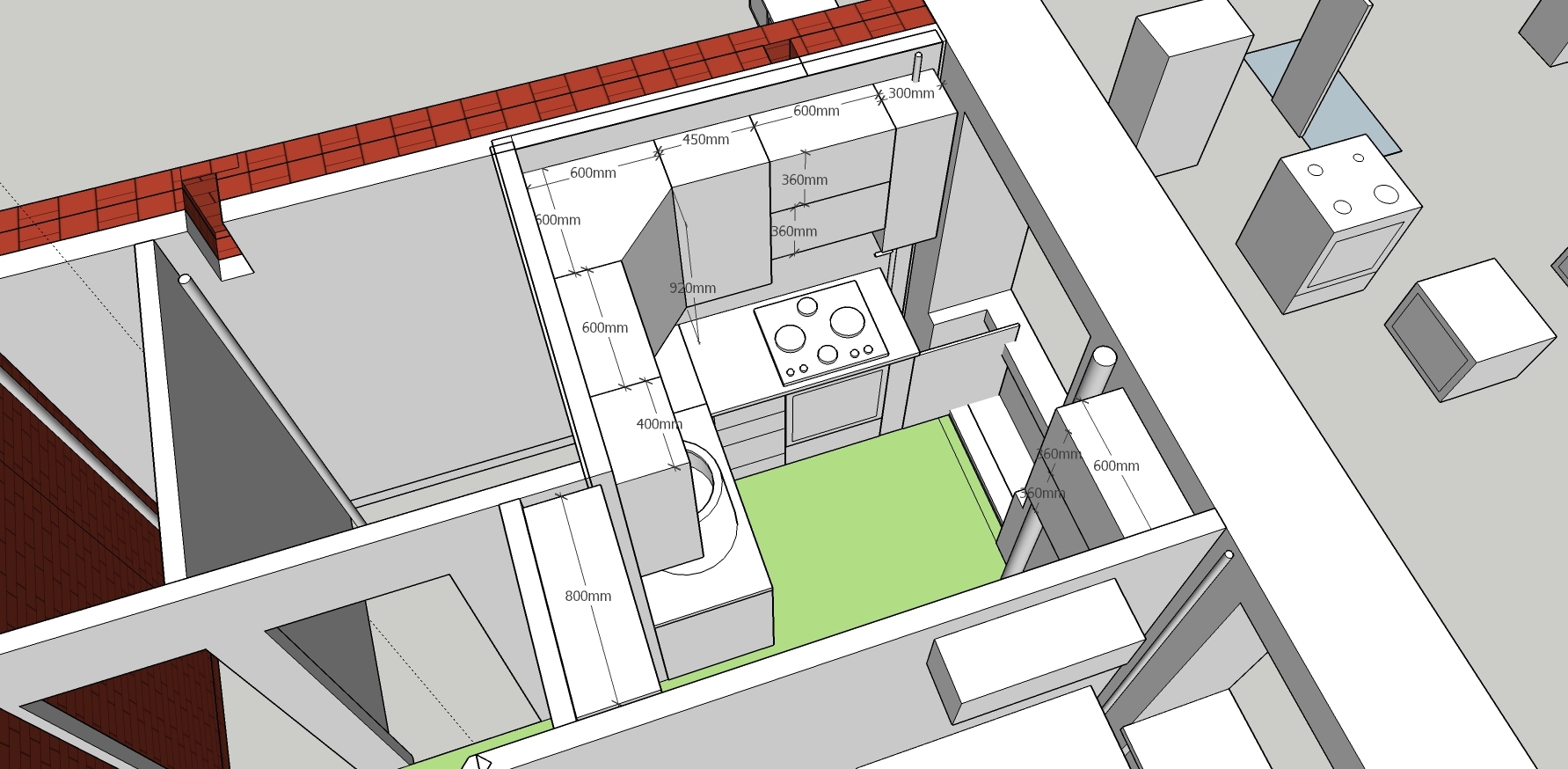 - продумали и скомбинировали элементы кухни в программе. (для рисования достаточно создать различных кубиков стандартных размеров с шагом по 10 см. )