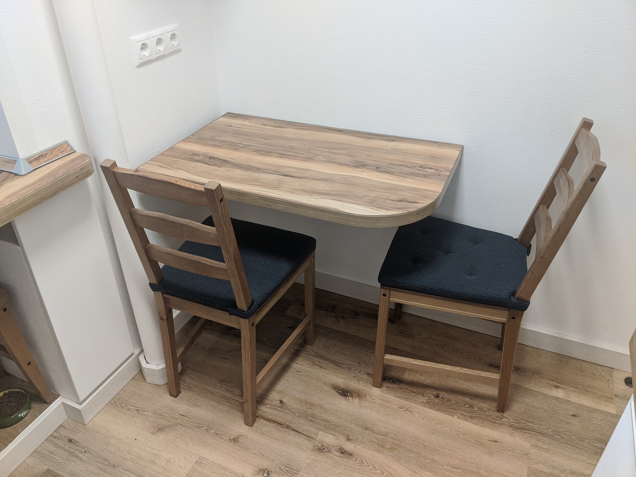 11) обеденный стол решили сделать самостоятельно из столешницы (осталась лишняя по ошибке). Чтобы ножки не мешали сделали его навесным. Кронштейны складываются , имеют несколько углов фиксации.