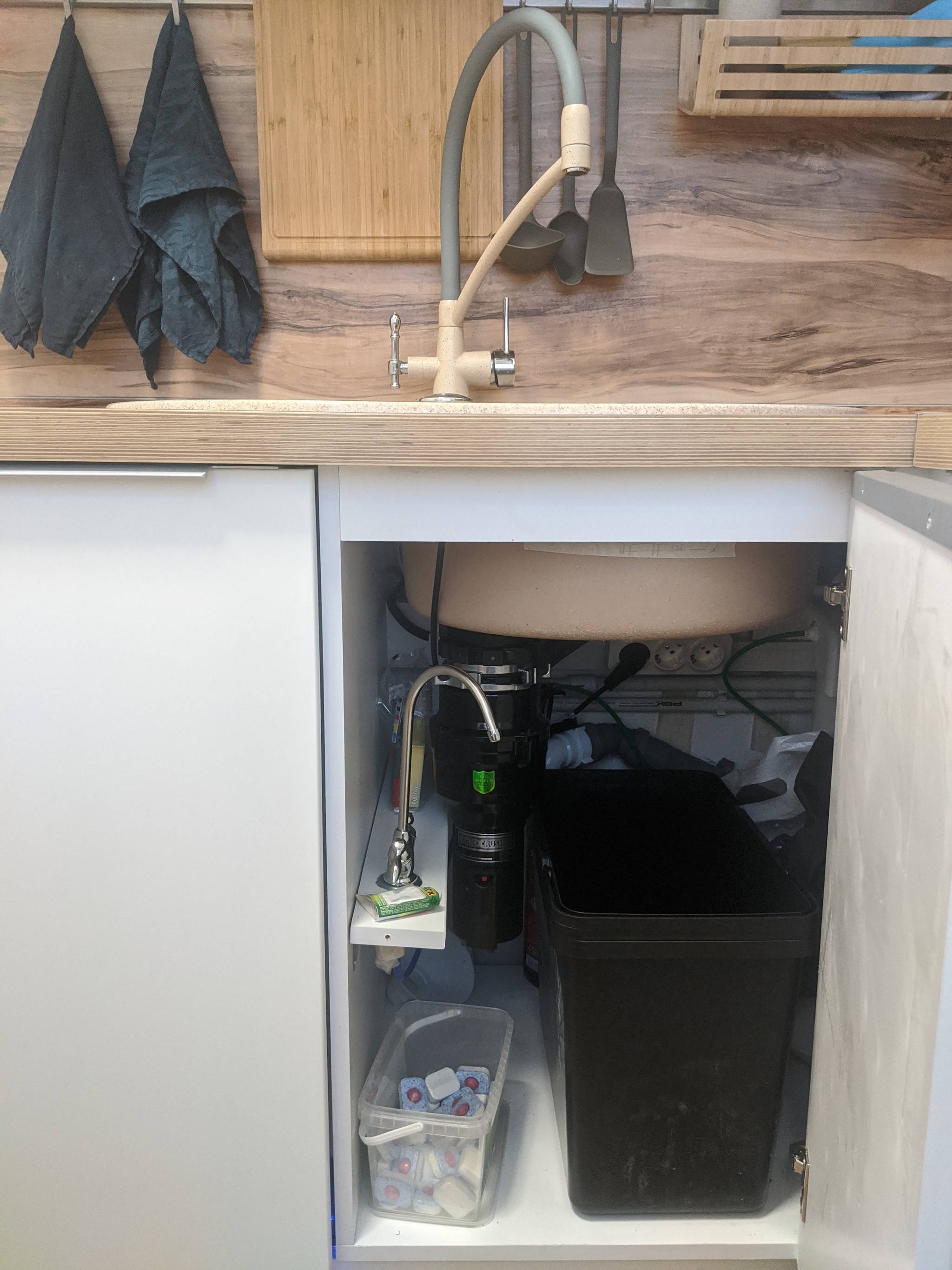 4) Измельчитель в раковине - очень полезная штука - одно из лучших решений. Хотя конечно было страшно - а вдруг это опасно. Но, попробовав, поняли как это просто и безопасно. Штатной пневмо кнопки вполне достаточно.