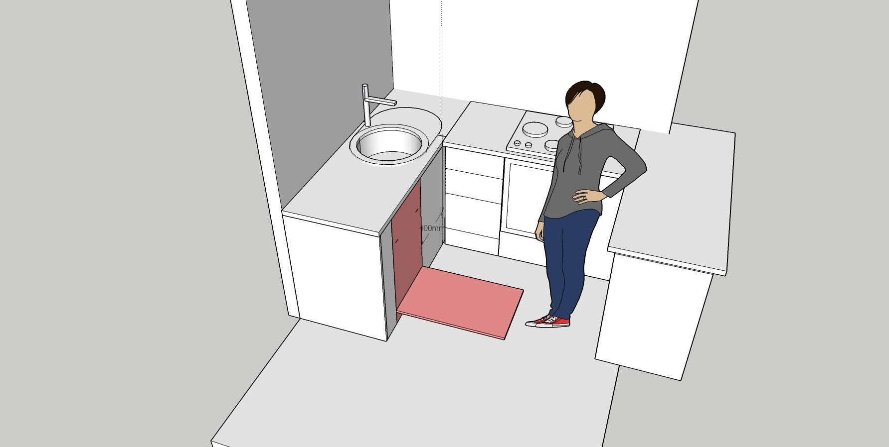 Вариант "В". победитель. Пусть машинка 45 см зато есть доступ с обеих сторон. На практике 5 см скругление угла все же удалось организовать и немного свисающую столешницу. Дверка под раковину 50 см (на чертеже 55)