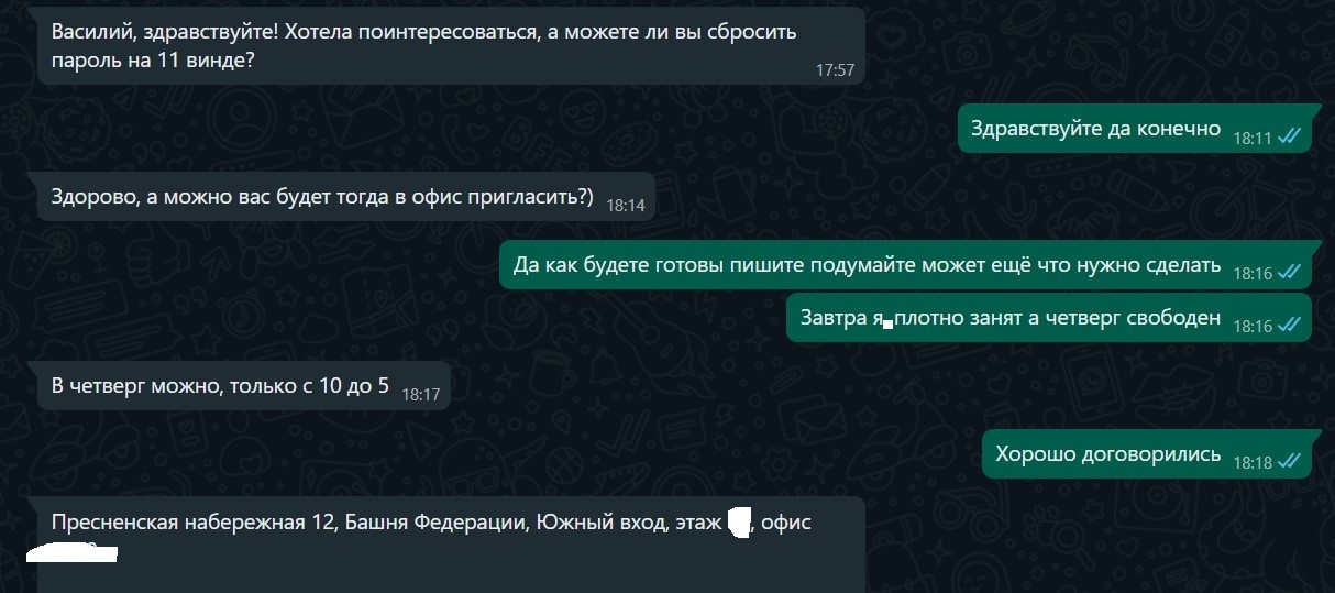 И вот ещё одна подобная компания, 60+ этаж башни Федерации панорамные окна, охуительный вид на Москву, что-то там разрабатывают для госуслуг. Вокруг разговоры о сумочках ценой в мой полугодовой доход, о ипотеках в центре. И ноут коммерческого директора, которая как-то приболела закрыла крышку ушла домой, вышла через неделю на работу, а пароль не подходит, а там внутри очень-очень важный проект, который никак нельзя потерять.