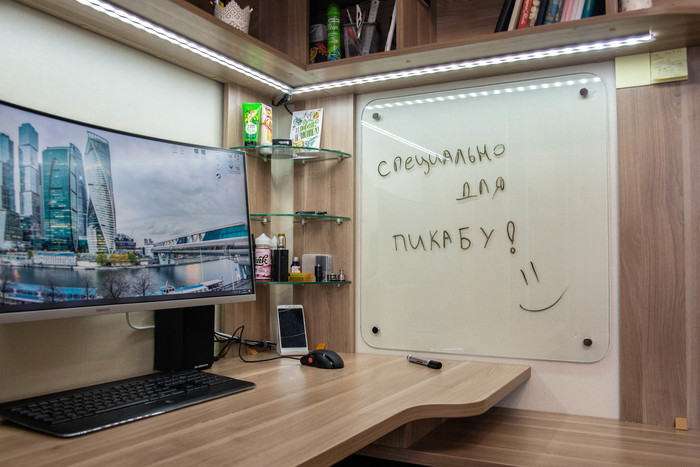 Итак. Стол готов, но хочется подсветку, сменить монитор, и справа стена пустует. Хочу маркерную доску!