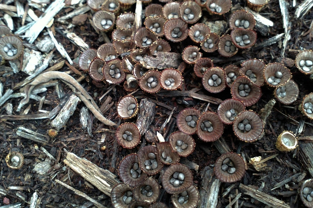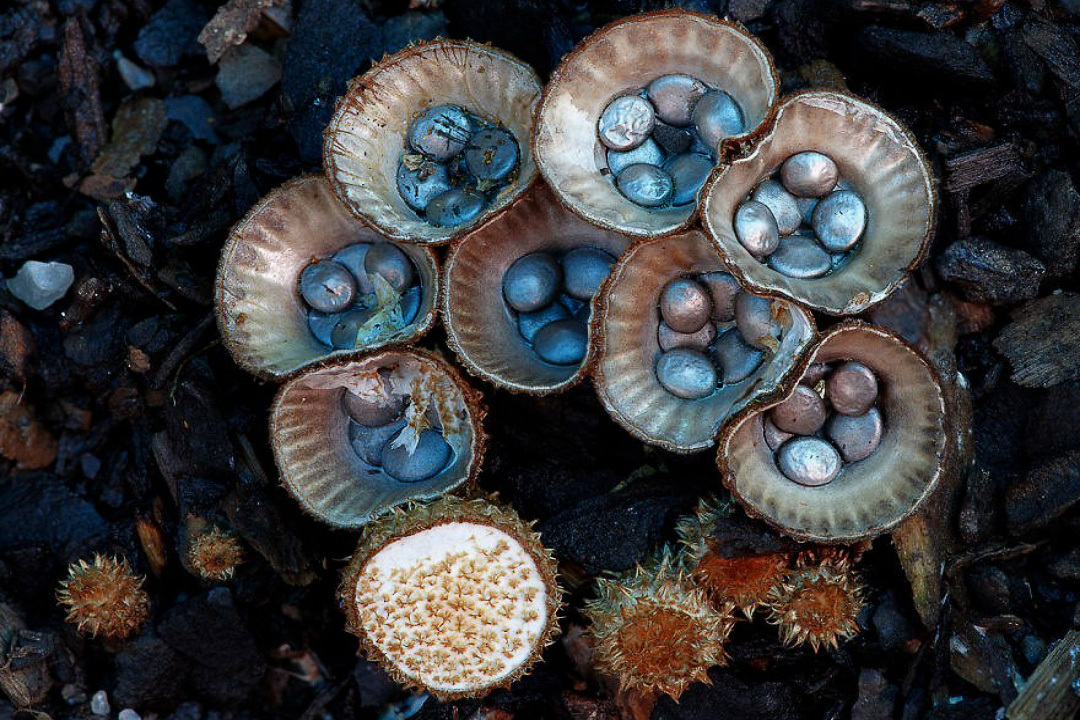 Внутри чаш лежат образования лентикулярной формы (то есть, похожие на таблетку с выпуклым верхом и низом). Эти перидиолы – специальные мешочки со спорами, при помощи которых гриб размножается.
