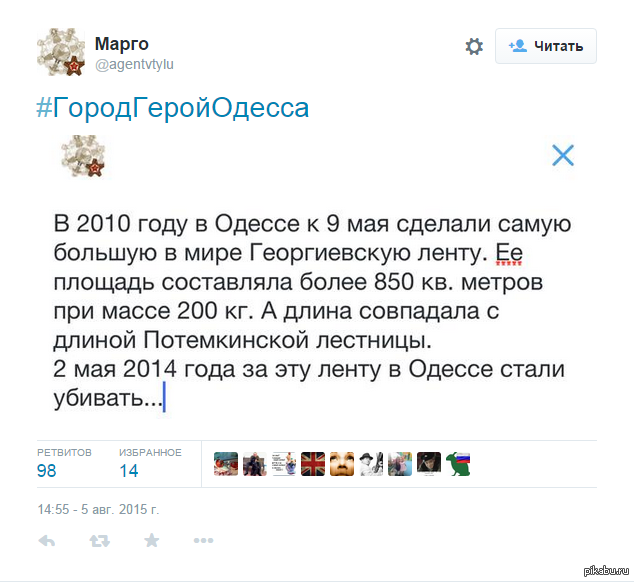 357 kachalckin Кому-то следует вручить награду имени Геббельса.... 10 лет назад https://twitter.com/agentvtylu/status/628897002206687233 Политика Украина Одесса Георгиевская ленточка Пропаганда Геббельс Одесский дом профсоюзов 9 мая - День Победы