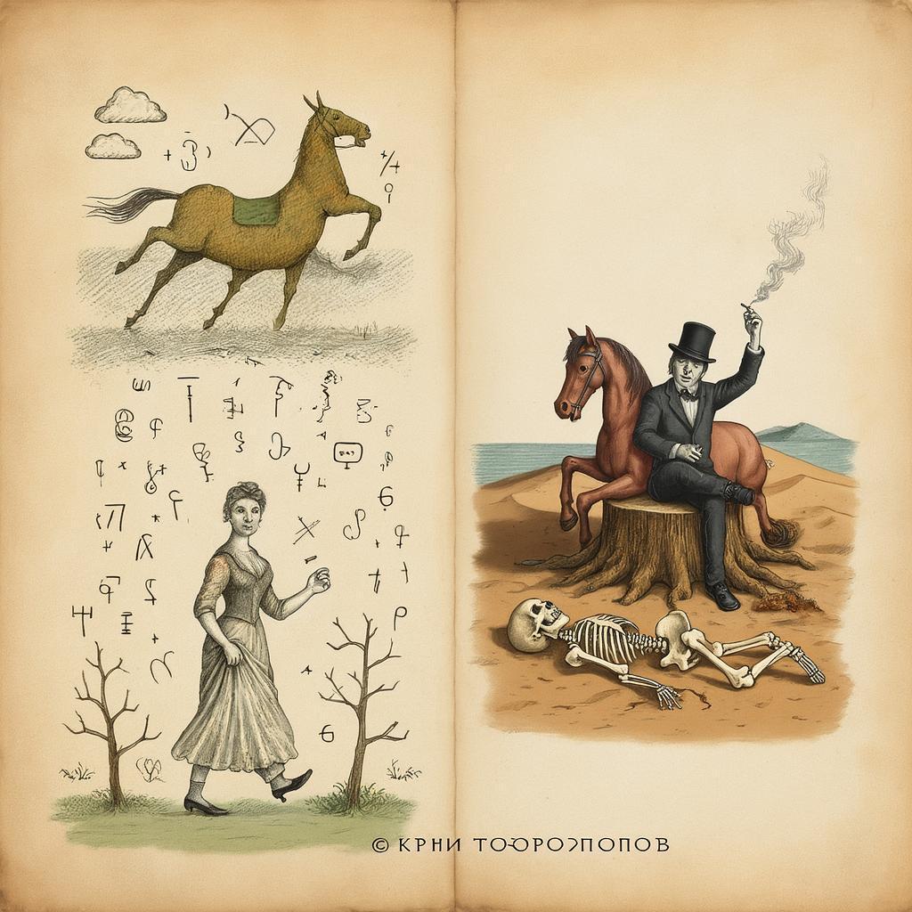 1. Шла женщина по пустыне и видит: стоит конь. "Почему конь, - подумала женщина. - когда это пень?" Смотрит, а это, действительно, пень, а не конь. И идёт она не по пустыне, а по лесу. Лес как лес, только деревьев нет. Удивилась женщина ещё больше: "Как это: лес, а деревьев нет? Не пойду туда..." Повернула она назад и попала в зыбучие пески. Так и погибла.