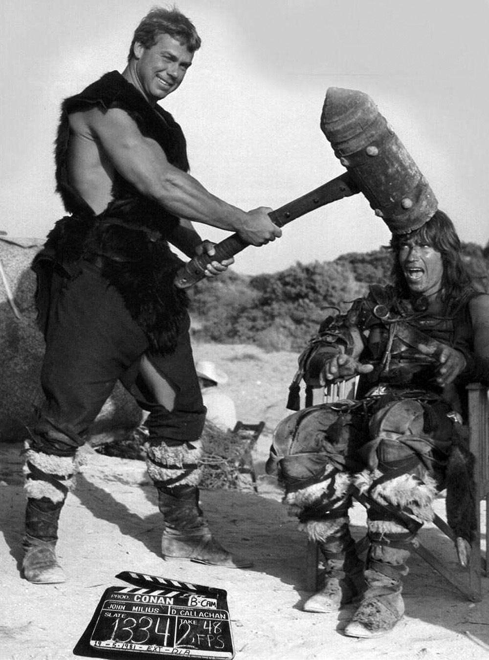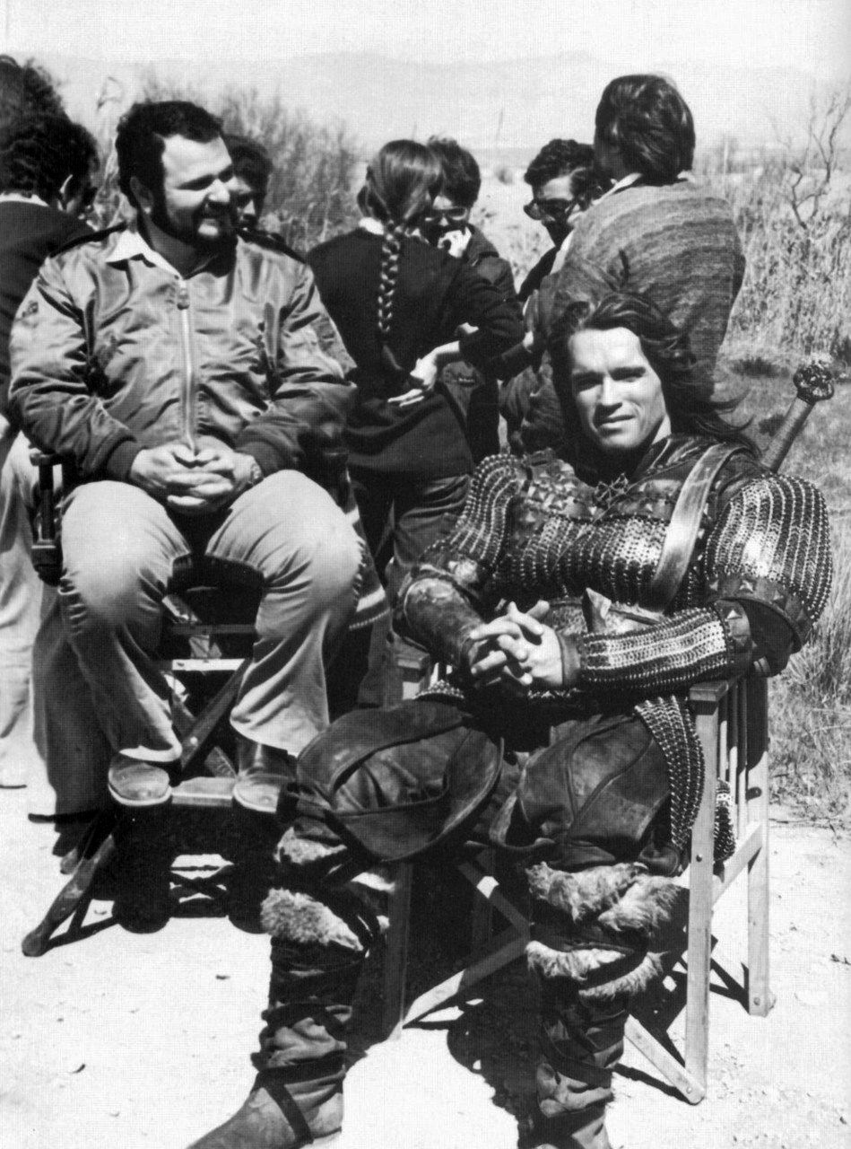 Джон Милиус и Арнольд Шварценеггер на съемках фильма «Конан-варвар»