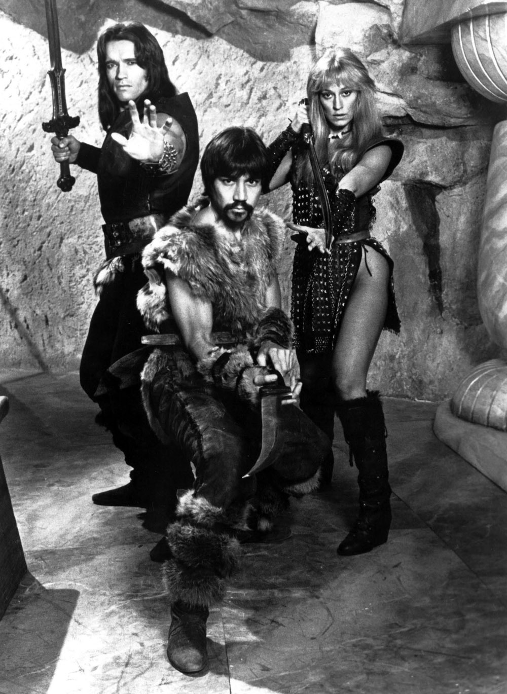 Арнольд Шварценеггер, Джерри Лопес и Сэндал Бергман на съемках фильма «Конан-варвар»