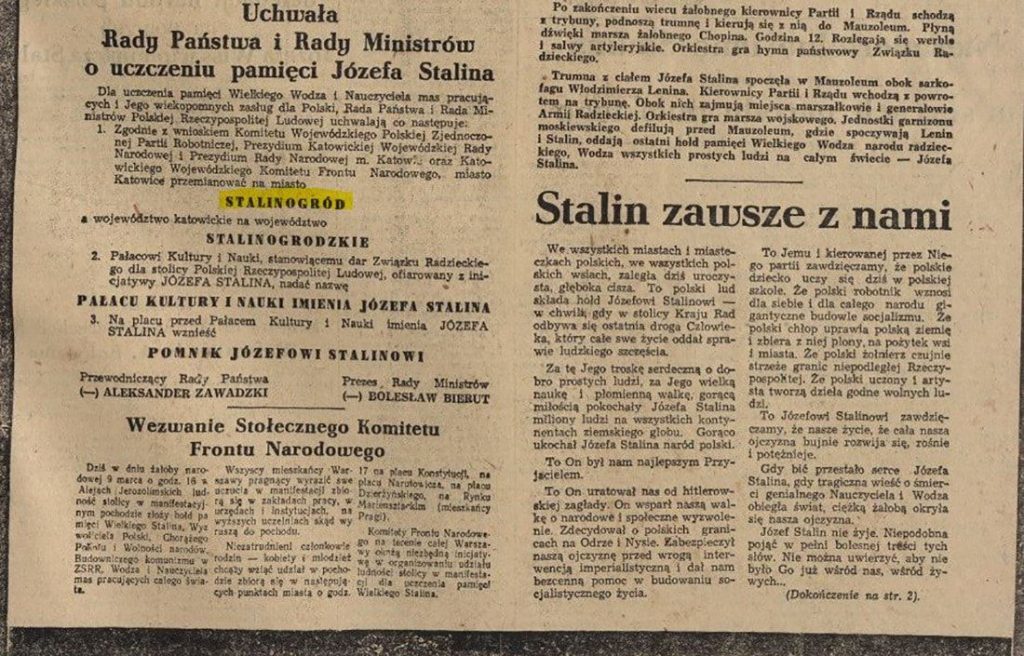 И всё же, в Польше и ГДР уже в середине марта 1953 г. по инициативе властей состоялись переименования в честь Сталина. Так, крупнейший центр польской угольной и химической промышленности Катовице 15 марта был переименован в Сталиногруд. В решении местной администрации отмечалось, что «по инициативе трудящихся Катовице и с одобрения руководства ПНР, наш город, освобожденный возглавляемой генералиссимусом Сталиным доблестной Советской армией от нацистской оккупации, получает название в честь Памяти И.В. Сталина». В тот период, напомним, во главе ПОРП и ПНР находились последователи сталинской линии Б. Берут и К. Мияль. Резонно предположить, что переименованием Катовице в Сталиногруд Варшава, забрасывала в Москву своеобразный «пробный шар». Однако никакой официальной реакции на это решение (за исключением краткого сообщения о данном переименовании в центральных советских СМИ) не последовало.