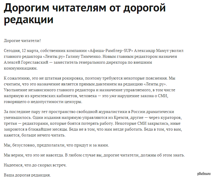 KeksZ 11 лет назад Конец единственной нормальной СМИ http://vk.com/lentach666?w=wall-29534144_1199161 Лентач Lenta ru
