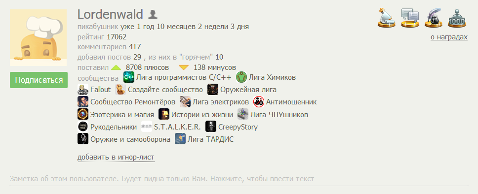> Также, @Lordenwald состоит в сообществах "CreepyStory", "Эзотерика и мистика", "Истории из жизни". Само по себе это ничего не значит, но в комплексе с другими фактами может означать, что у человека не только хорошее воображение, но к тому же, он прочитал много вымышленных и реальных историй, и может комбинировать элементы из них для создания собственных.