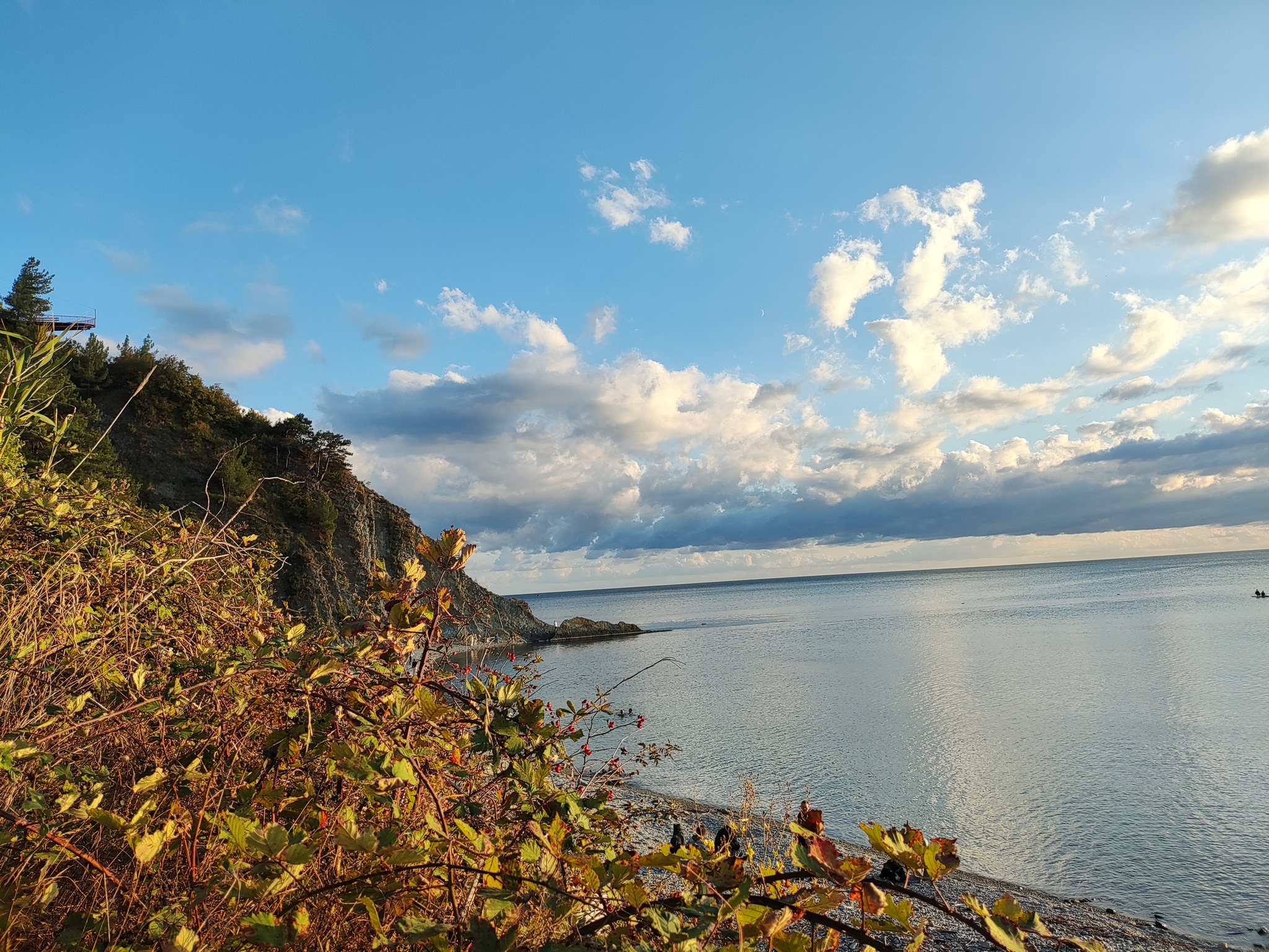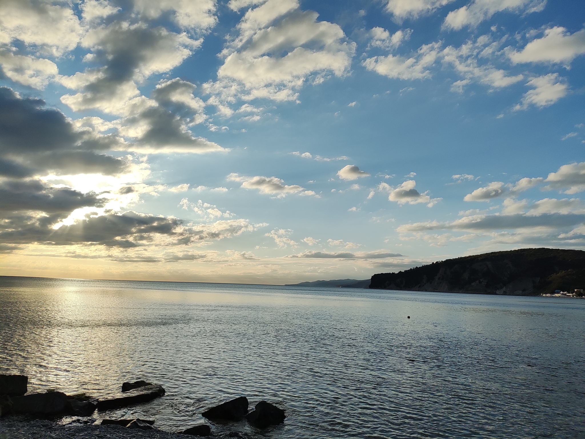 Осень, как всегда, пришла внезапно. И неожиданно. Ещё зелены деревья. Разноцветная листва едва-едва намечается в кронах деревьев и кустов. Но резко, очень резко похолодало. И холодный северный ветер принес тучи и дождь... А вода в море ещё теплая, +22 градуса. И можно купаться... Или просто сидеть на берегу и проникаться игрою света и тени на воде...