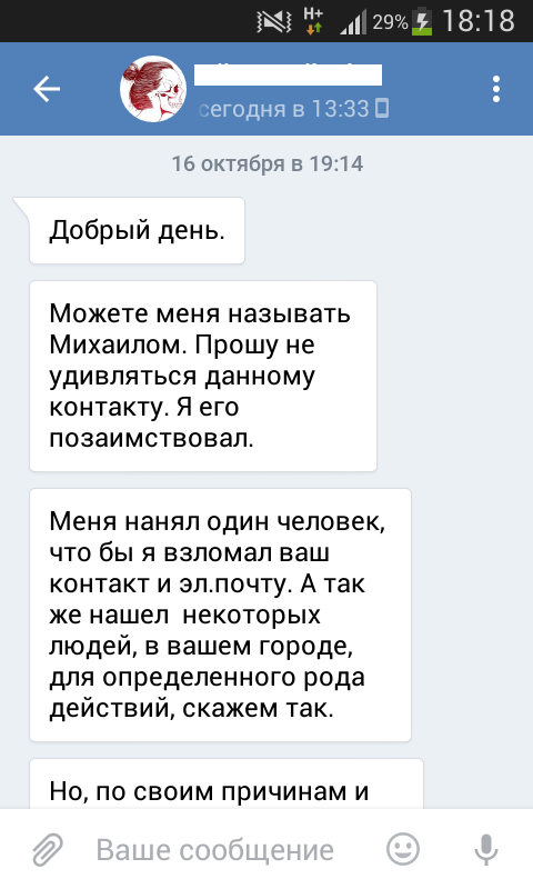 В общем всё как обычно, ничего особенного, обсуждение местности, где я проживаю и так далее. После этого сей "человек" начинает новую партию угроз: