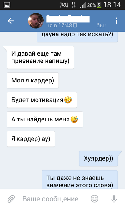 Далее этот человек как и положено великому и ужасному администратору говногруппки забанил меня, а в сообщениях у нас состоялся следующий диалог: