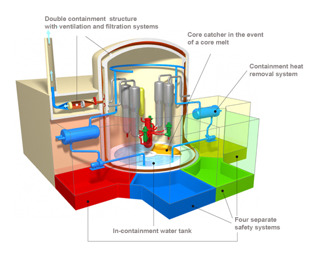 В ноябре 2007 года АРЕВА создала совместное предприятие с японским концерном MHI. Заинтригованы названием партнера? Не стоит, это «старый знакомый» – Mitsubishi Heavy Industries. Решение о том, что надо диверсифицировать направления деятельности и идти в атомный проект Мицубиши приняла одновременно с Toshiba, но не смогли выдержать конкуренции с коллегами при покупке Westinghouse. Совместное предприятие французов и японцев называется АТМЕА и создано оно было для разработки, маркетинга, продажи, строительства и ввода в эксплуатацию реактора поколения III+ АТМЕА-1 – легководного, с мощностью 1150-1200 МВт. Так сказать, брат-близнец нашего ВВЭР-1200, но вот при таких могучих «родителях». При разработке был учтен опыт европейских реакторов KONVOI и EPR в Европе и APWR Tomari-3 в Японии – джентльменам имелось, на что опереться.