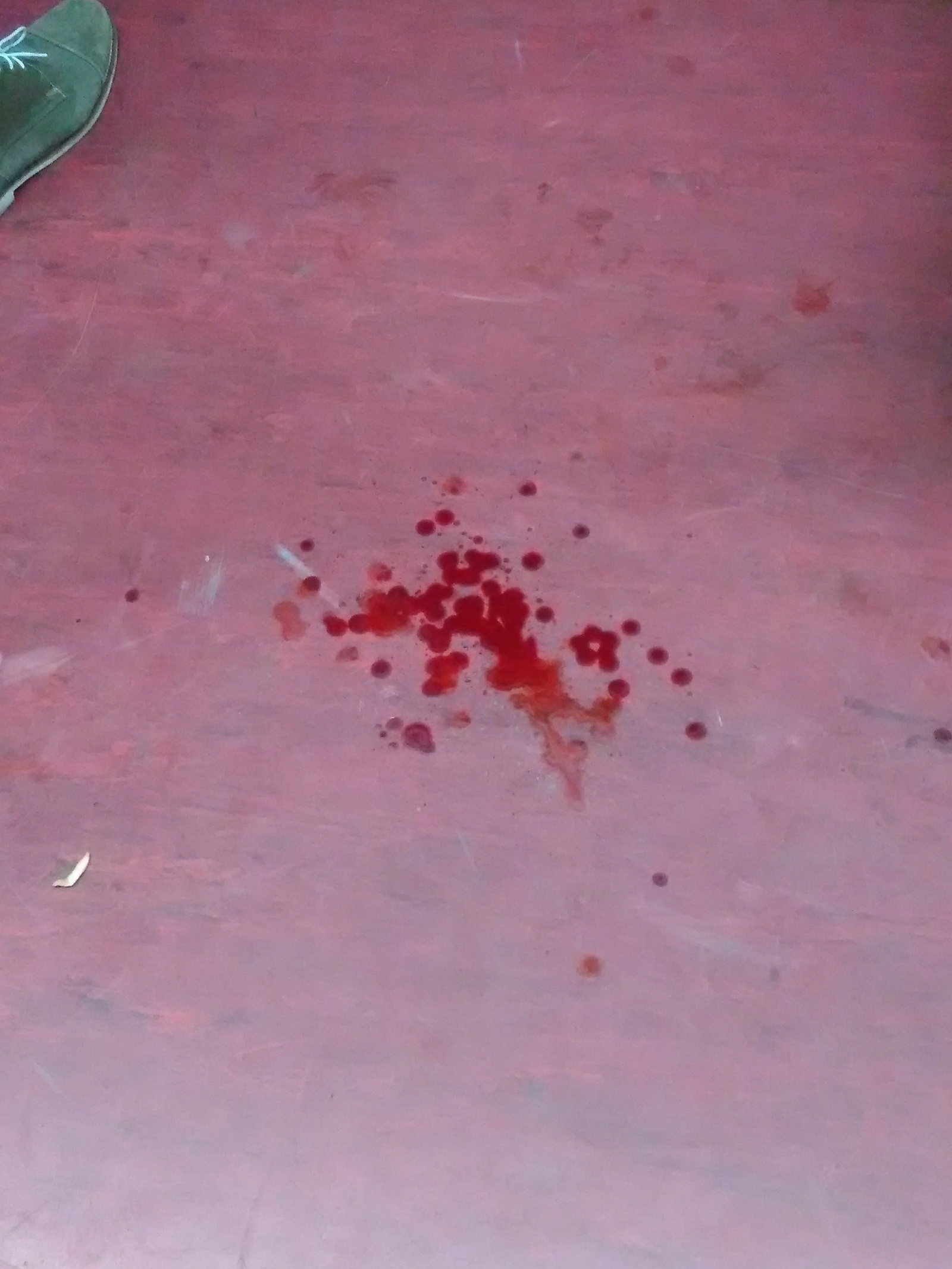 Моя гипотеза что это неглубокий порез руки или это кровотечение из носа у ребенка (у взрослого человека капли бы разбивались о пол).