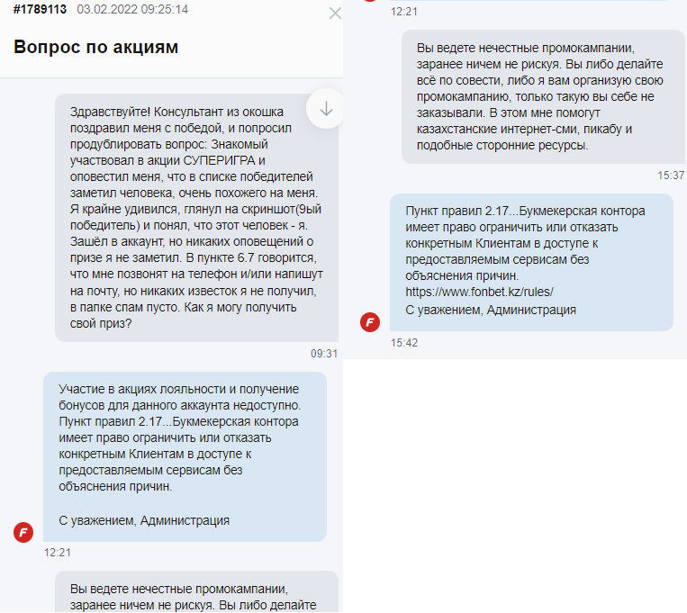 Потенциальный ответ от фонбета очевиден: Максим, вы какой-то не такой, в следствии чего, приз, согласно пункту правил 6.8 будет пере разыгран.