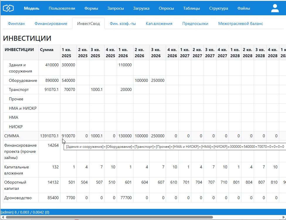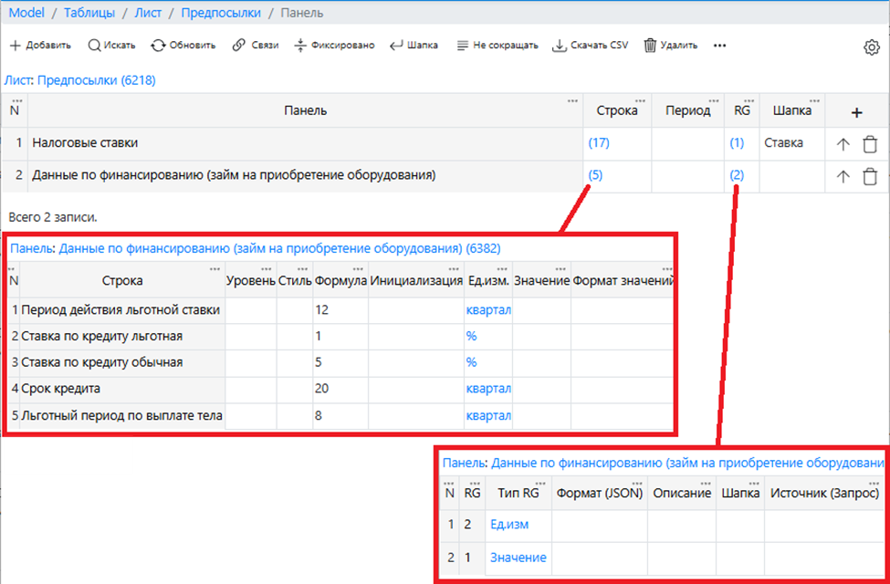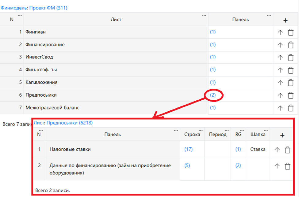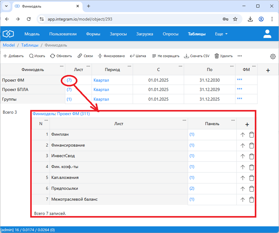 Модель хранится в таблице Финмодель, у которой есть подчиненные таблицы: листы модели, панели (таблицы) на листах, строки (статьи) в панелях.