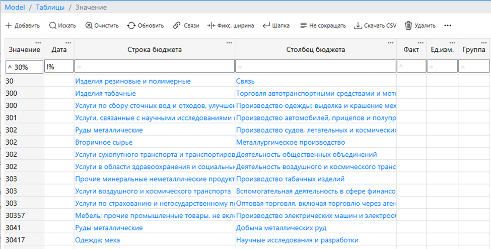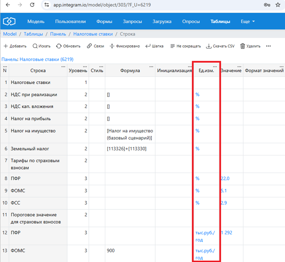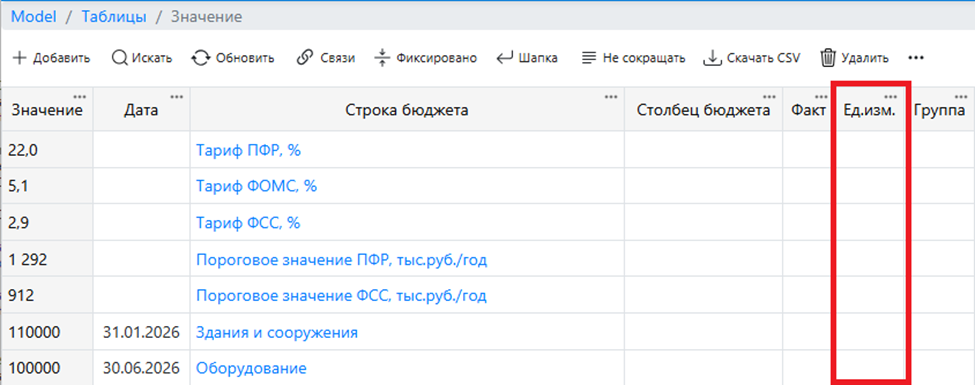 Эта группа представлена единственной колонкой, в которой выводится найденная единица измерения для значения текущей строки. Единица измерения может быть указана на уровне строки модели (она идет с высшим приоритетом):