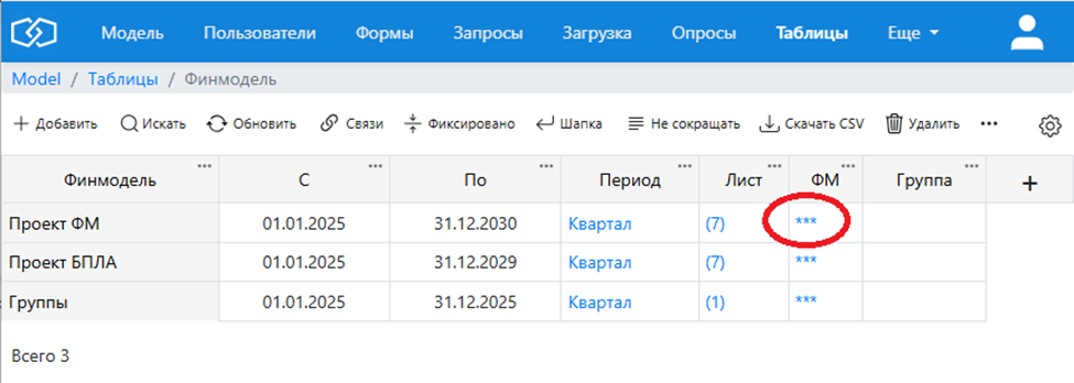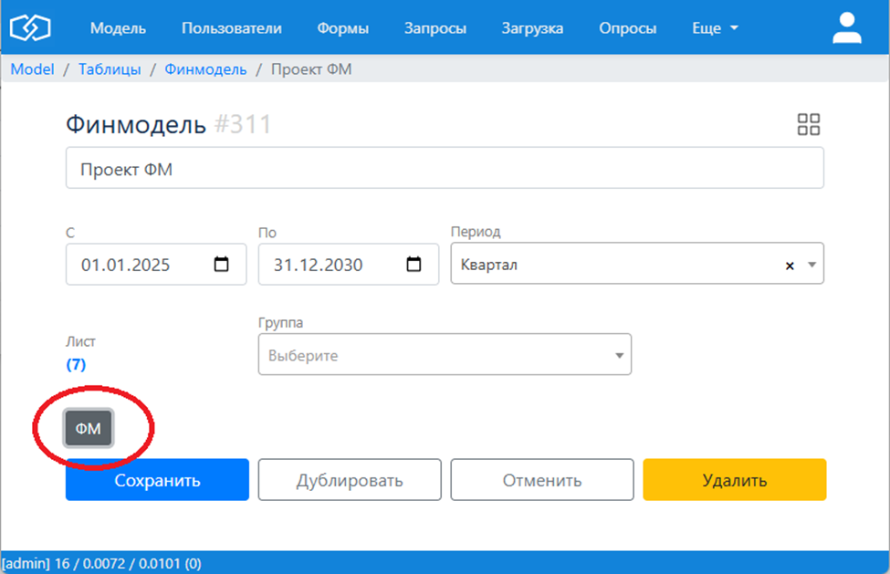 У модели есть кнопка «ФМ», которая запускает расчет этой модели, в таблице моделей: