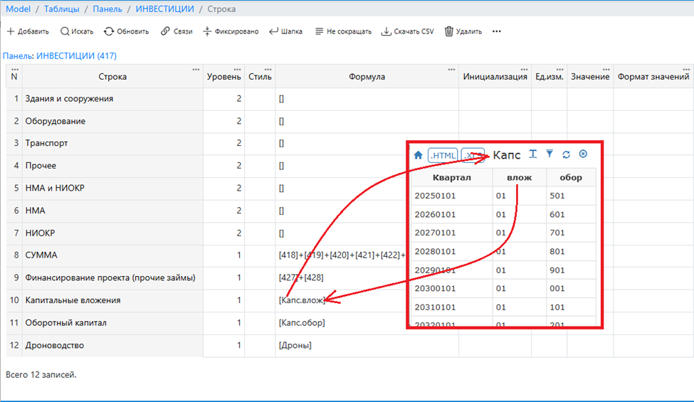 Запрос Капс вернет множество записей актуальных на период, указанный в модели. Через точку после имени запроса указывается имя поля, из которого необходимо брать данные в эту ячейку, например, Капс.влож будет использовать колонку влож из отчета Капс.