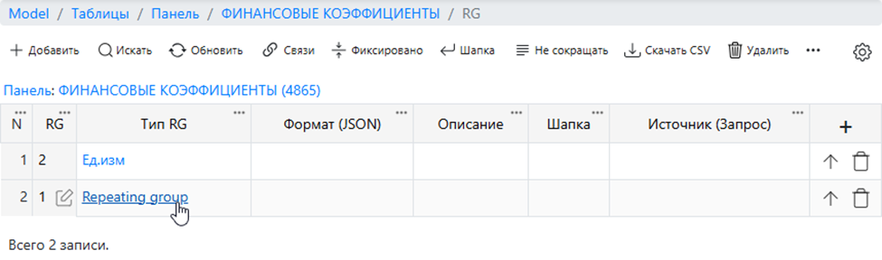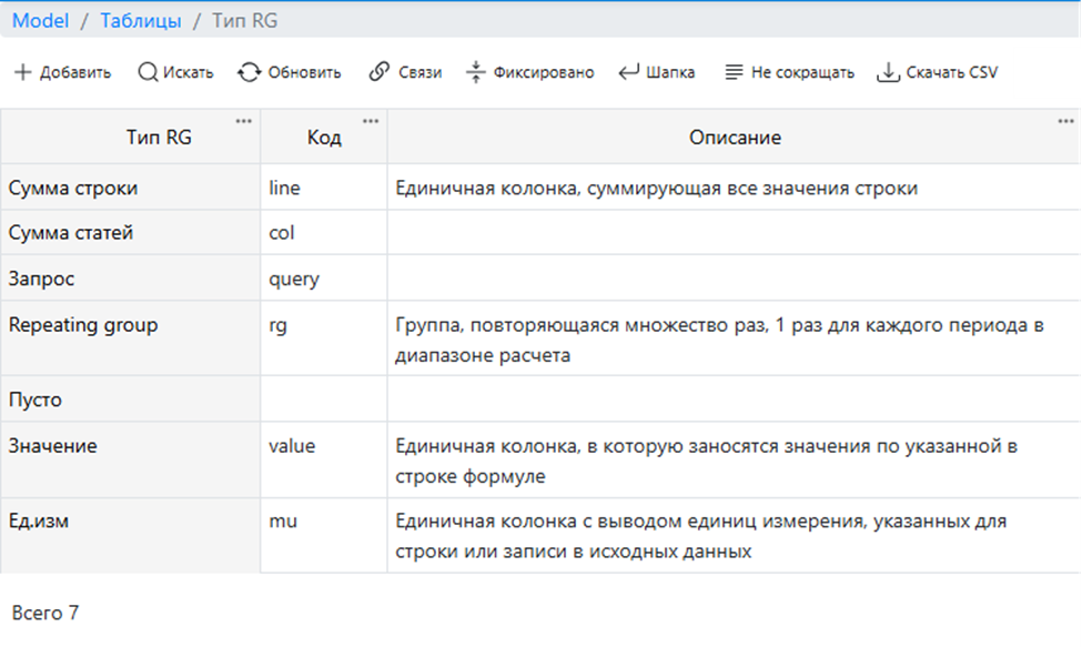 Самая простая группа, для которой создается единственная колонка данных, заполняемая данными из самой строки или записанной в строке модели формулы.