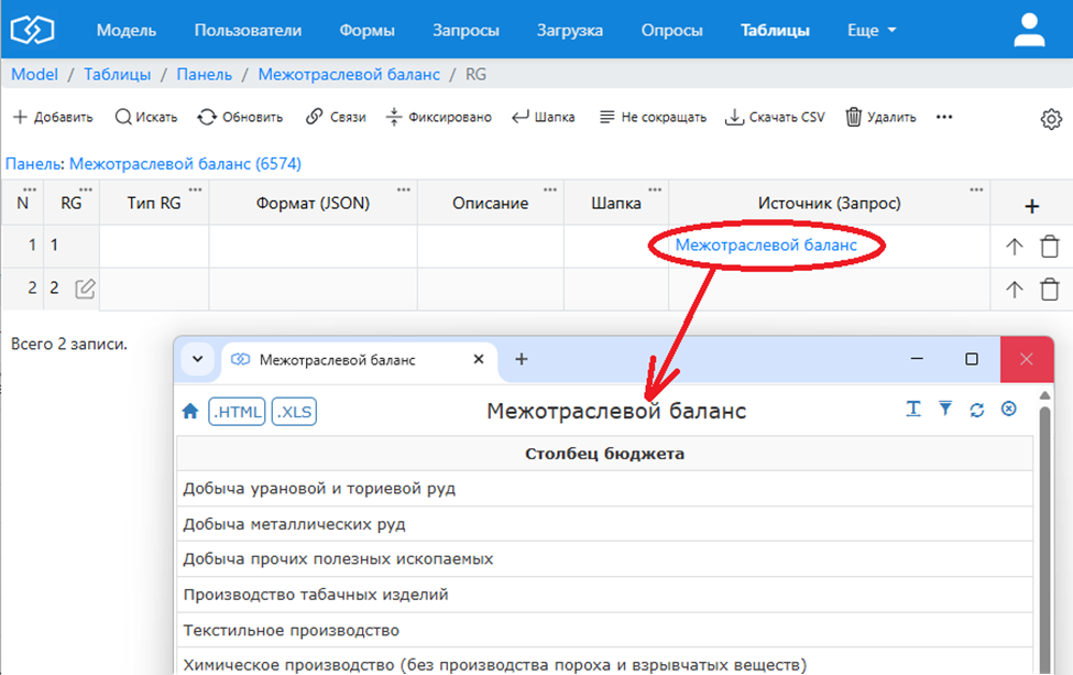 Например, если требуется создать матрицу строк выпускаемой продукции (строки таблицы) и отраслей, которые участвуют в её производстве (столбцы), то мы укажем запрос со списком отраслей как источник списка колонок для группы: