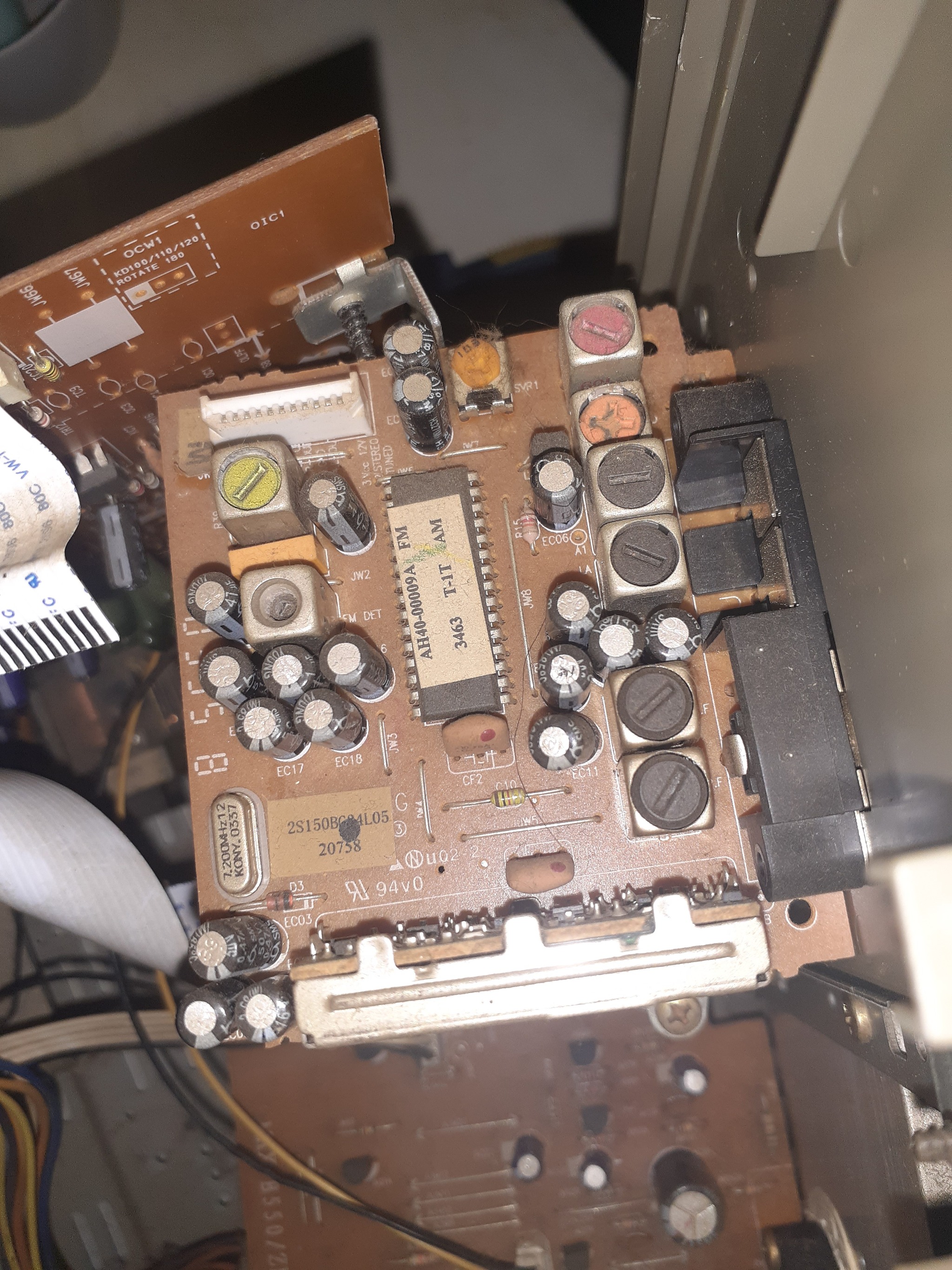 Произвёл чистку оптики диска - диски зачитал , замену конденсатора на правом канале - усилитель полностью заработал , произвёл чистку линейного входа от застрявшего обломка штеккера тюльпана (самое сложное - весь пришлось разобрать и молотком выбивать😁), произвёл замену сгнившего пассика в кассетной деке по гандоновой системе , чистку головок , прижимных роликов , тон валов - обе деки заработали одна даже с "открытым ртом" , сделал антенну для радио из проволоки .