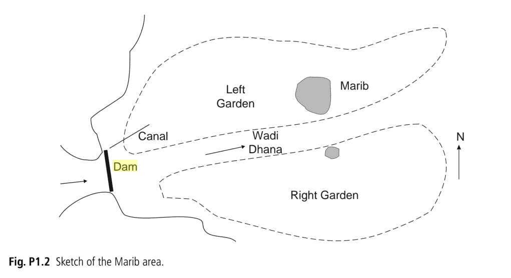 Схема расположения на местности Мариба и плотины. Пунктиром обозначены два сада, упоминаемые в Коране.