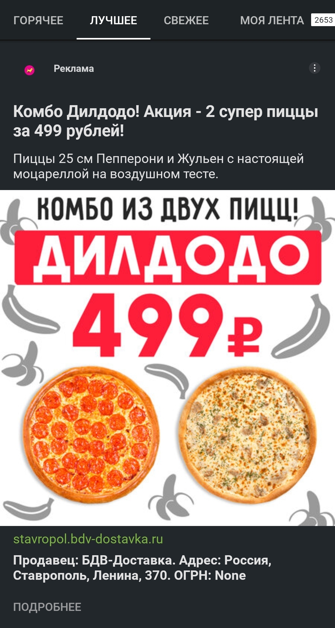 3 TARA26 WOW реклама Контекстная реклама что-то обо мне, видимо, знает... Какое-то неожиданное сочетание ... 3 года назад [моё] Креативная реклама Пицца Странности Контекстная реклама Реклама на Пикабу 1 Ещё 0