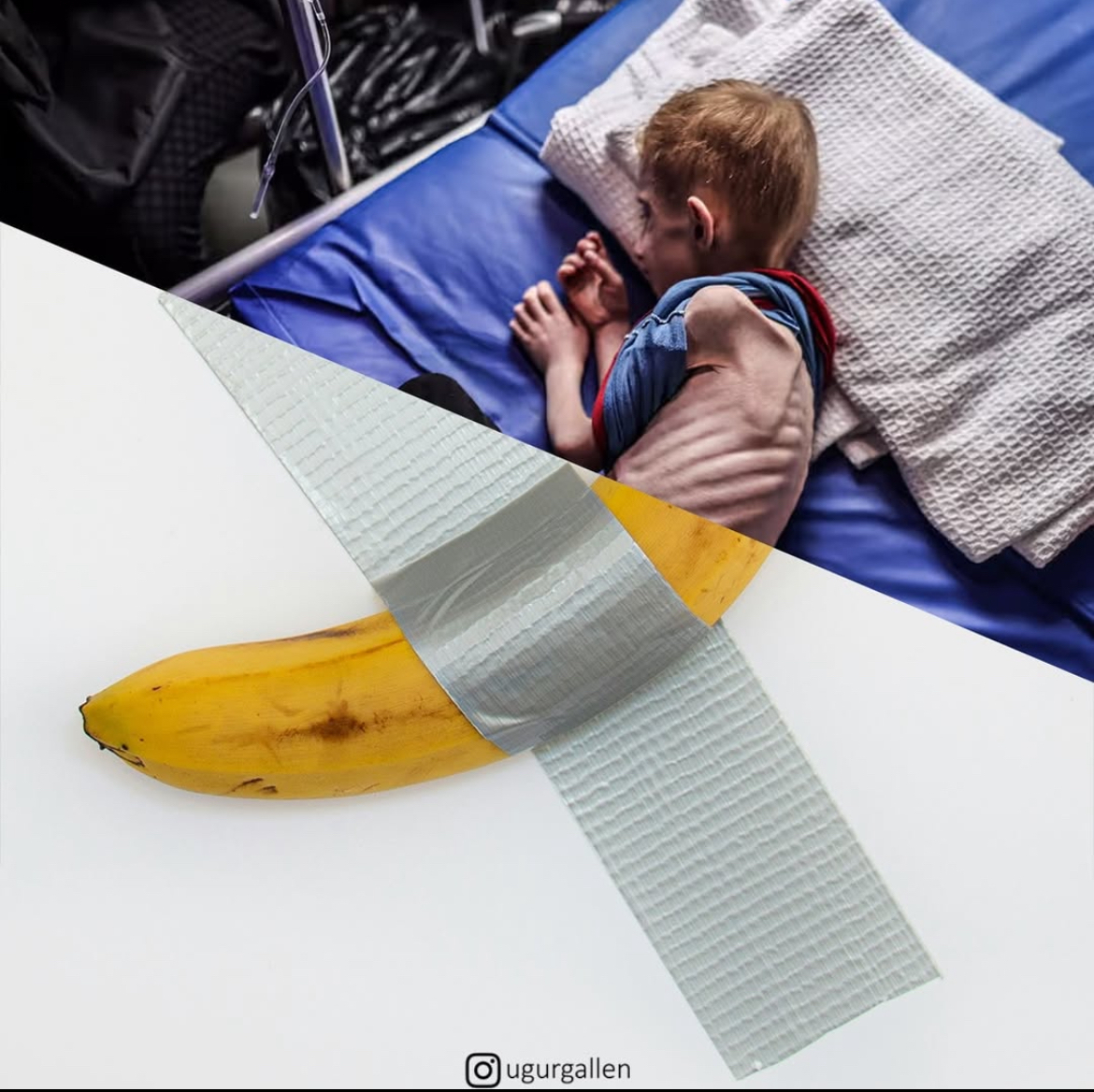 Банан со скотчем - это «произведение современного искусства», проданное за 6.2 млн долларов в благодатном «белом мире». А слева истощенный ребенок, который явно недоедает, в стране третьего мира, ссылка на статью про банан под фото