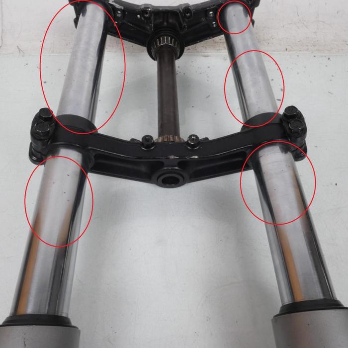 Аккуратно протираем зеркало перьев вилки салфеткой. Встаём на подножки мотоцикла, зажимаем передний тормоз и интенсивно качаем вилку несколько раз. Протираем перья еще раз салфеткой и смотрим: если видны масляные пятна, то сальники вилки скоро нужно будет менять. Это повод не для расстройства, но для торга.