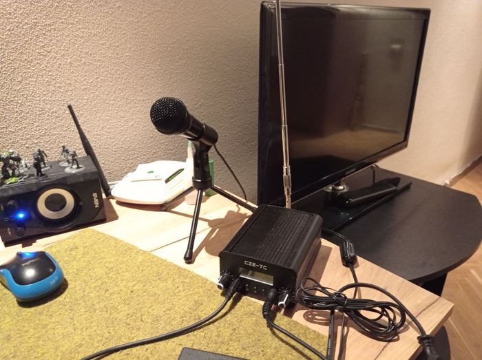 Радиопередатчик вещает в режиме пониженой мощности радиусом в километр, в повышенном на 2.5. Что покрывает спокойно требуемую площадь. ФМ диапазон позволяет любым игрокам включить свое радио и настроится на мою частоту и добавить себе атмосферы в локацию. Помимо всего Мастерам есть возможность вещать по микрофону. И обьявлять о технических нюансах на игре.