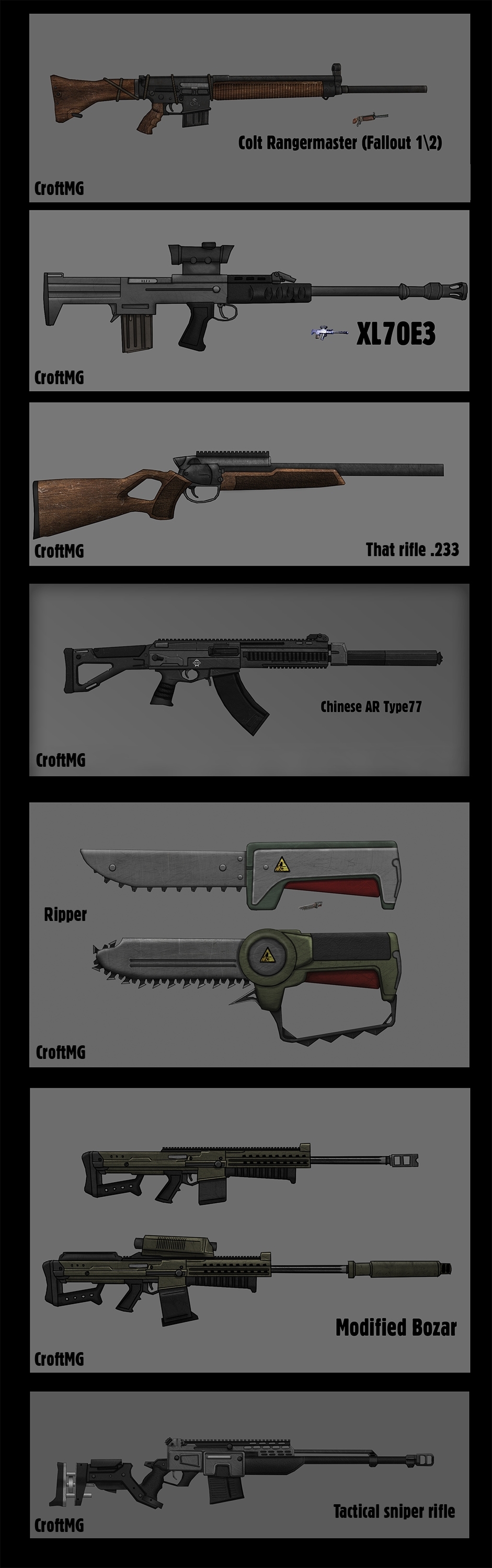Всё это великолепие рисовал мышкой в фотошопе, я старался воссоздать некоторое оружие из Fallout 1\2 по мелким иконкам из игры (охотничья винтовка, потрошитель и штурмовая винтовка XL70E3) . В довесок оттюнинговал оружие из Fallout 3\NV (Револьвер "тот самый" до переделки в обрез, тактическая модификация китайского автомата, модифицированный снайперский пулемет "Бозар" и снайперская винтовка на тактический манер) Ну-с, надеюсь вам понравится (знаю что кривовато нарисовано, в фотошопе я самоучка)