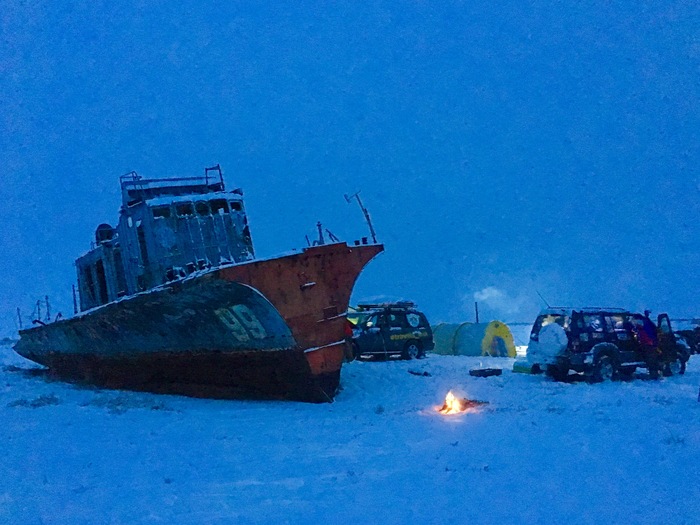 Если 99 стоял прямо посреди солончака, то эти корабли лежат на краю моря, в воде. Мы подъезжали к ним по льду. Спящие гиганты..