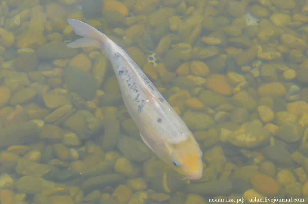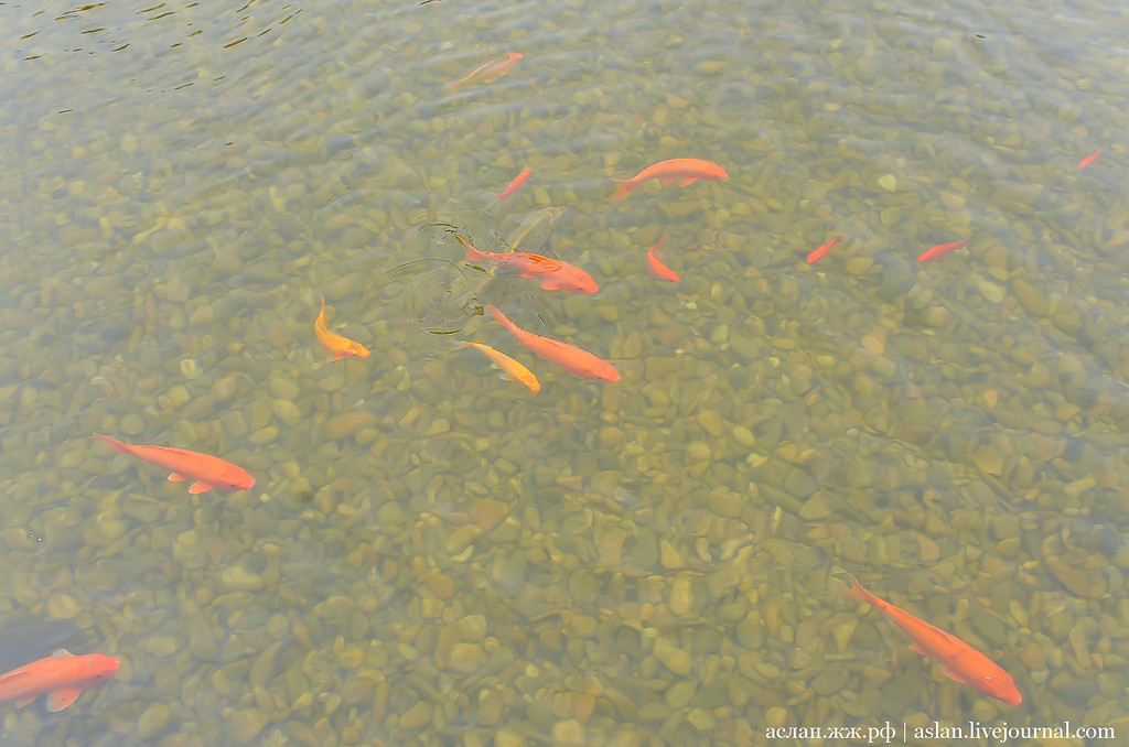 Рядом чистейший прудик, в котором живут рыбы кои.